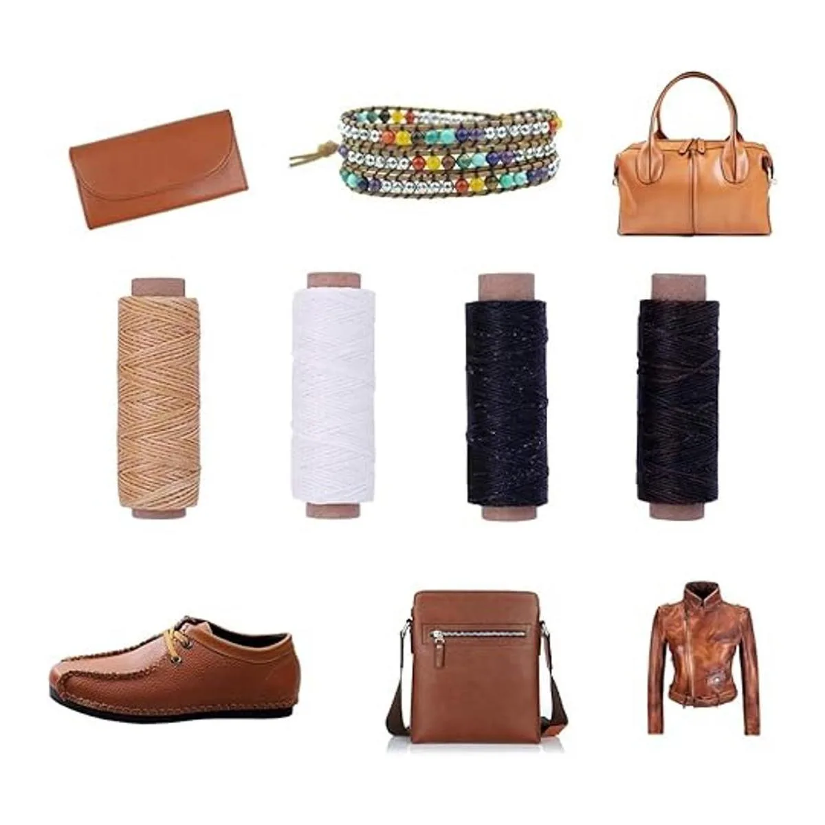 Hilos encerados: 4 rollos de hilo de cuero en 4 colores diferentes que pueden satisfacer todas tus necesidades, que están recubiertos con cera y apretarán los puntos más fácilmente. Estos hilos de reparación de cuero son de 0.03 pulgadas de diámetro. Colores: blanco, negro, café oscuro, color natural.