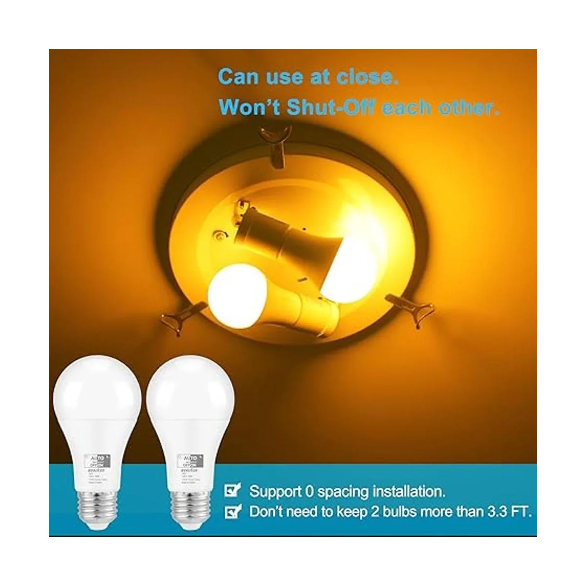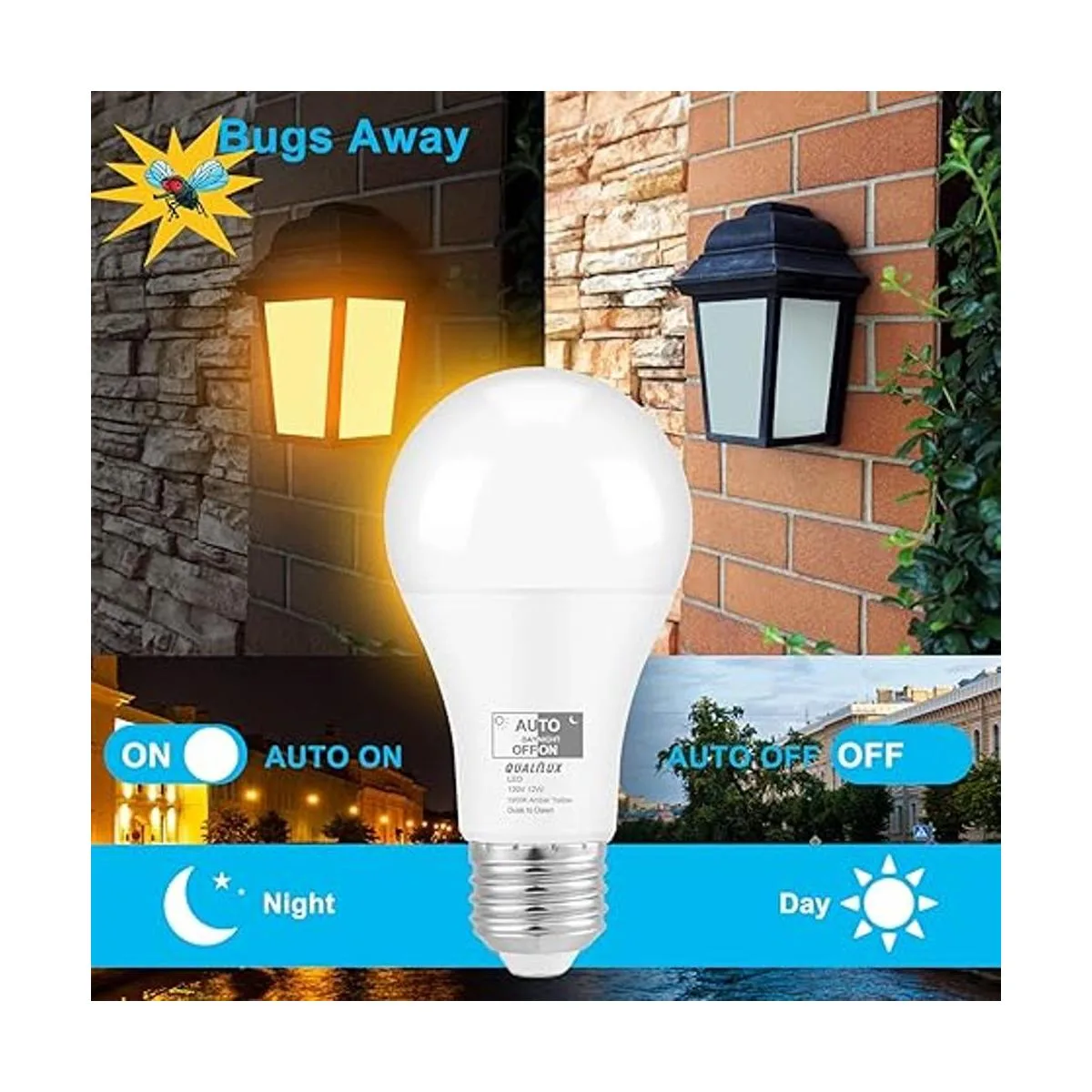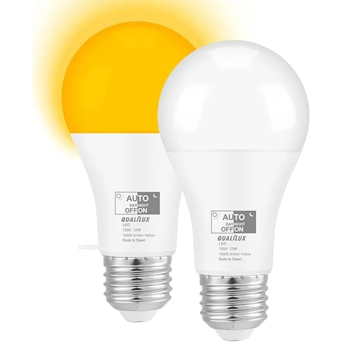 QUALILUX Bombillas para insectos del atardecer al amanecer de 12 W, 800 lúmenes, bombillas con sensor de fotocélula de detección de luz amarilla de 1900 K, encendido y apagado automático, LED A19 E26, paquete de 2