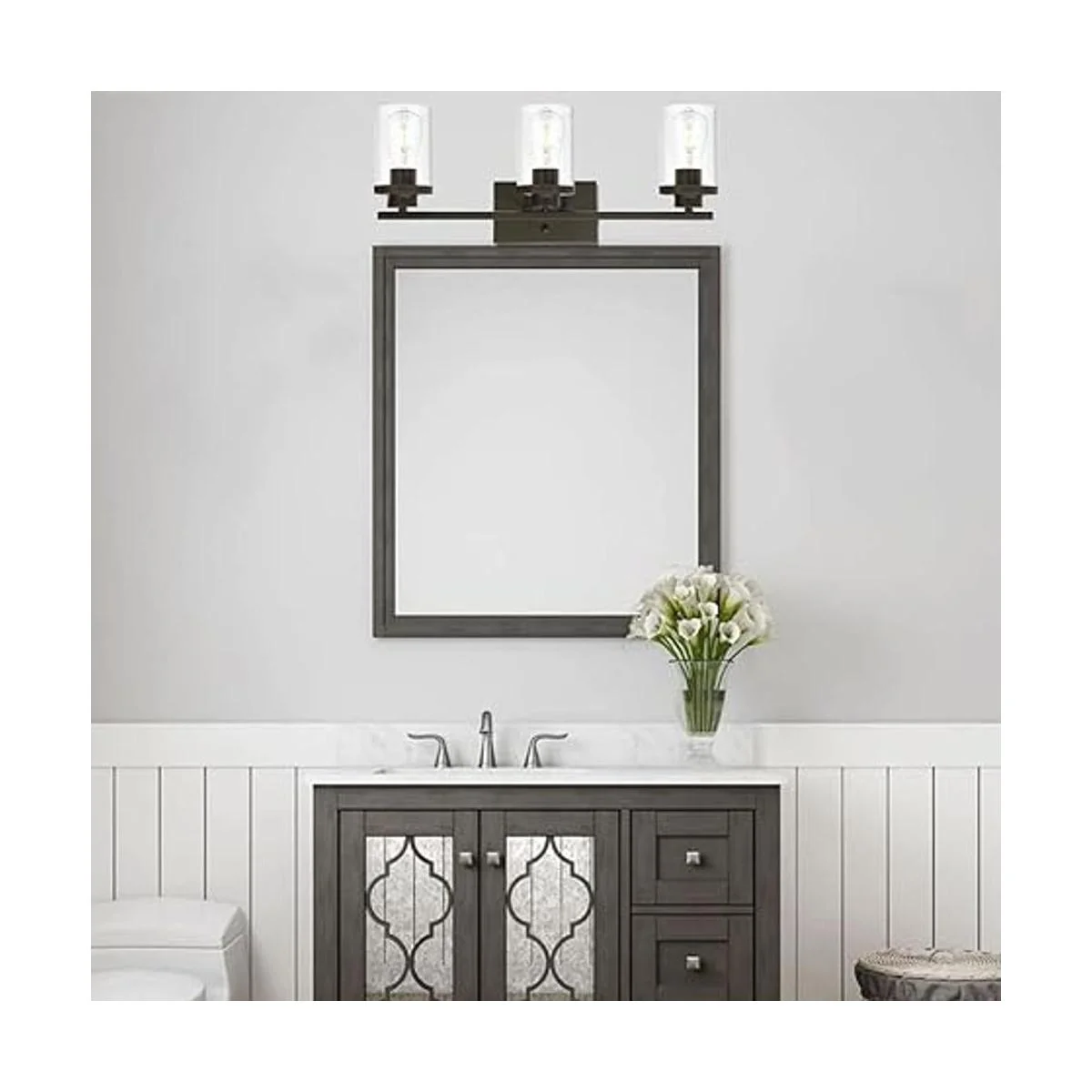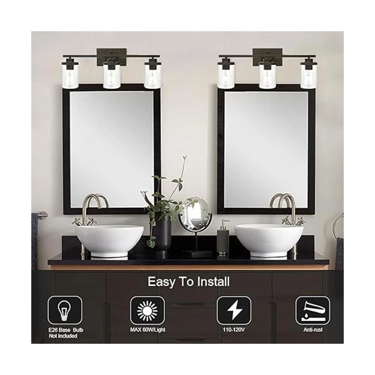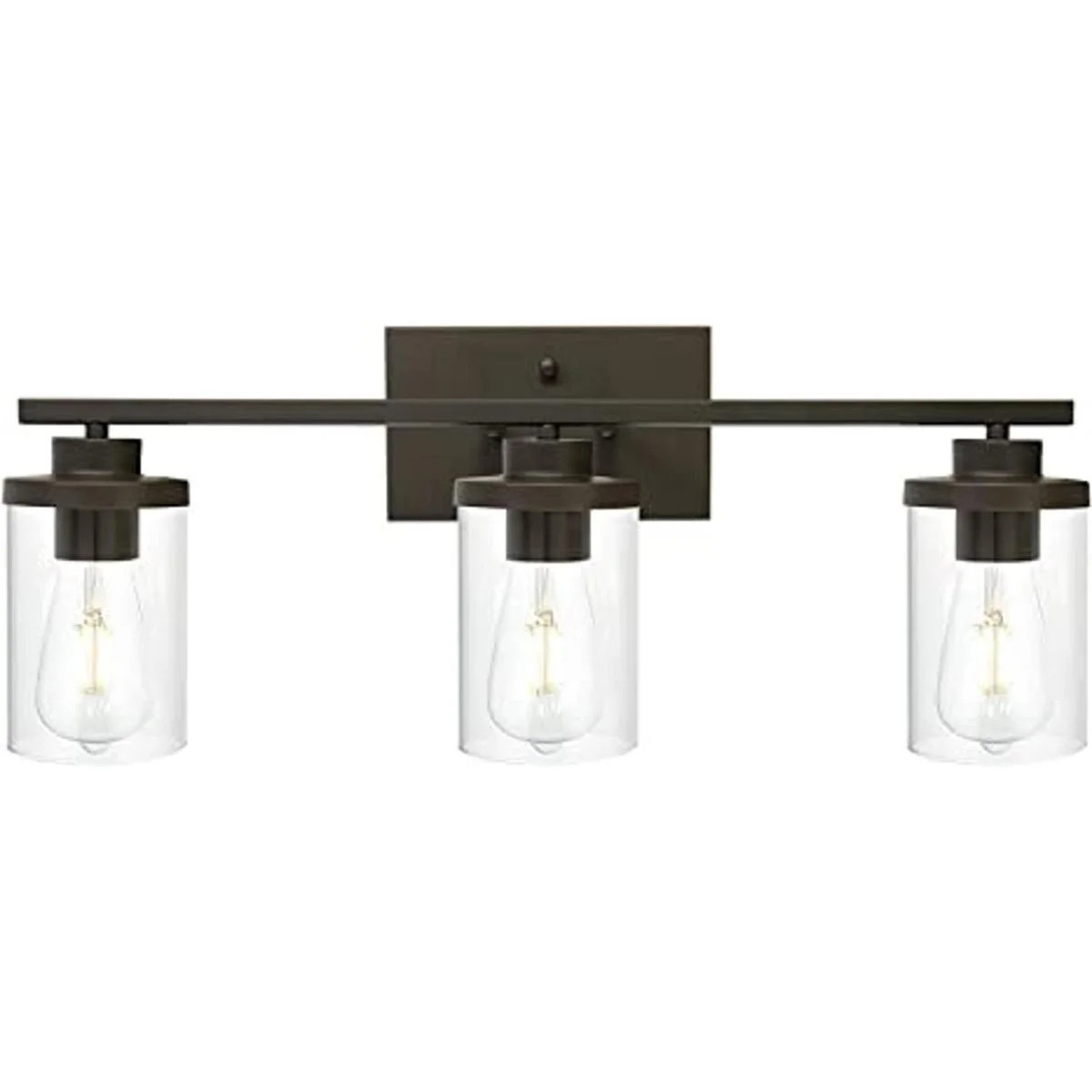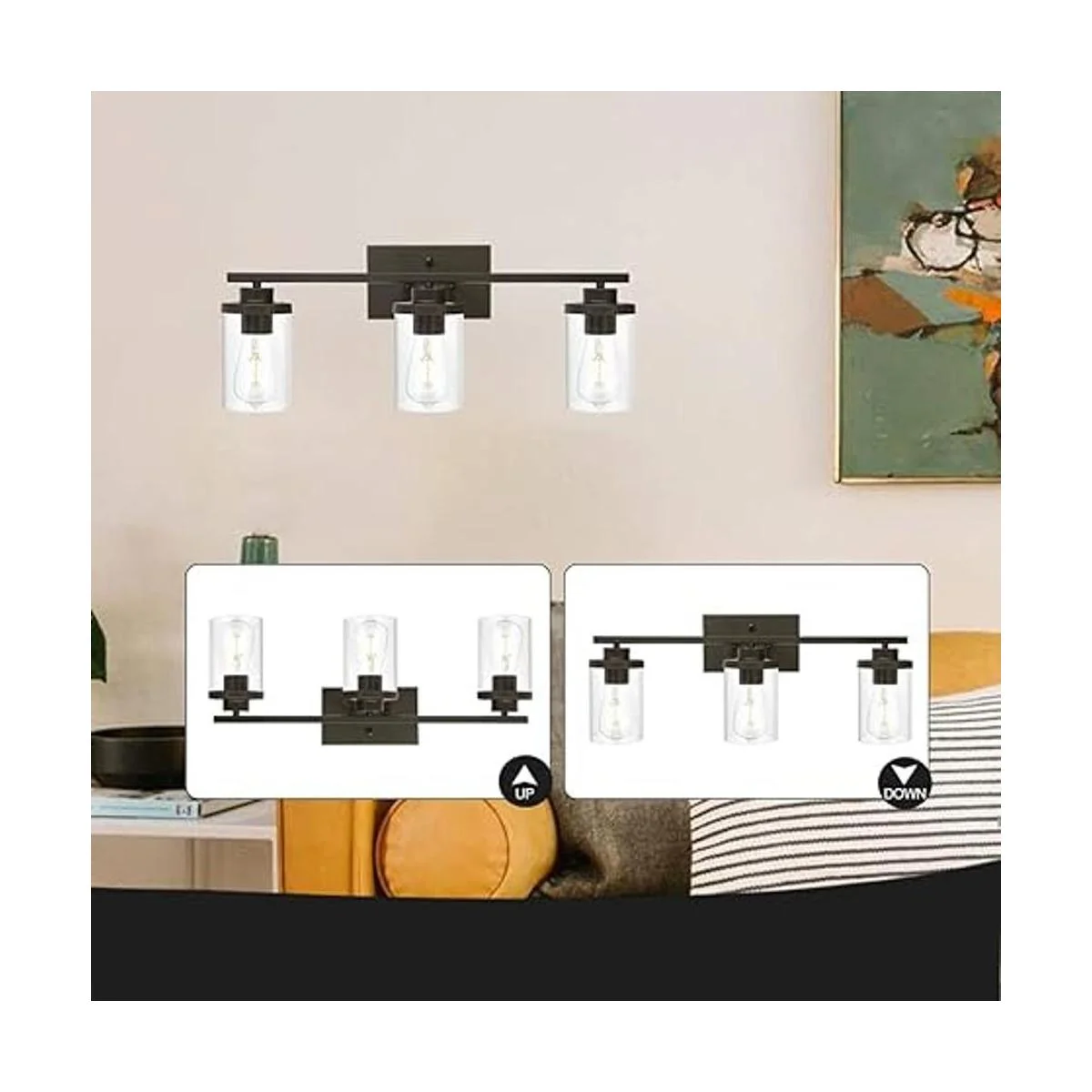 QueeuQ Iluminación de tocador de baño, 3 luces con pantalla de vidrio transparente, acabado de bronce aceitado, apliques de baño industriales, iluminación sobre espejo, accesorio de pared para sala de estar, cocina