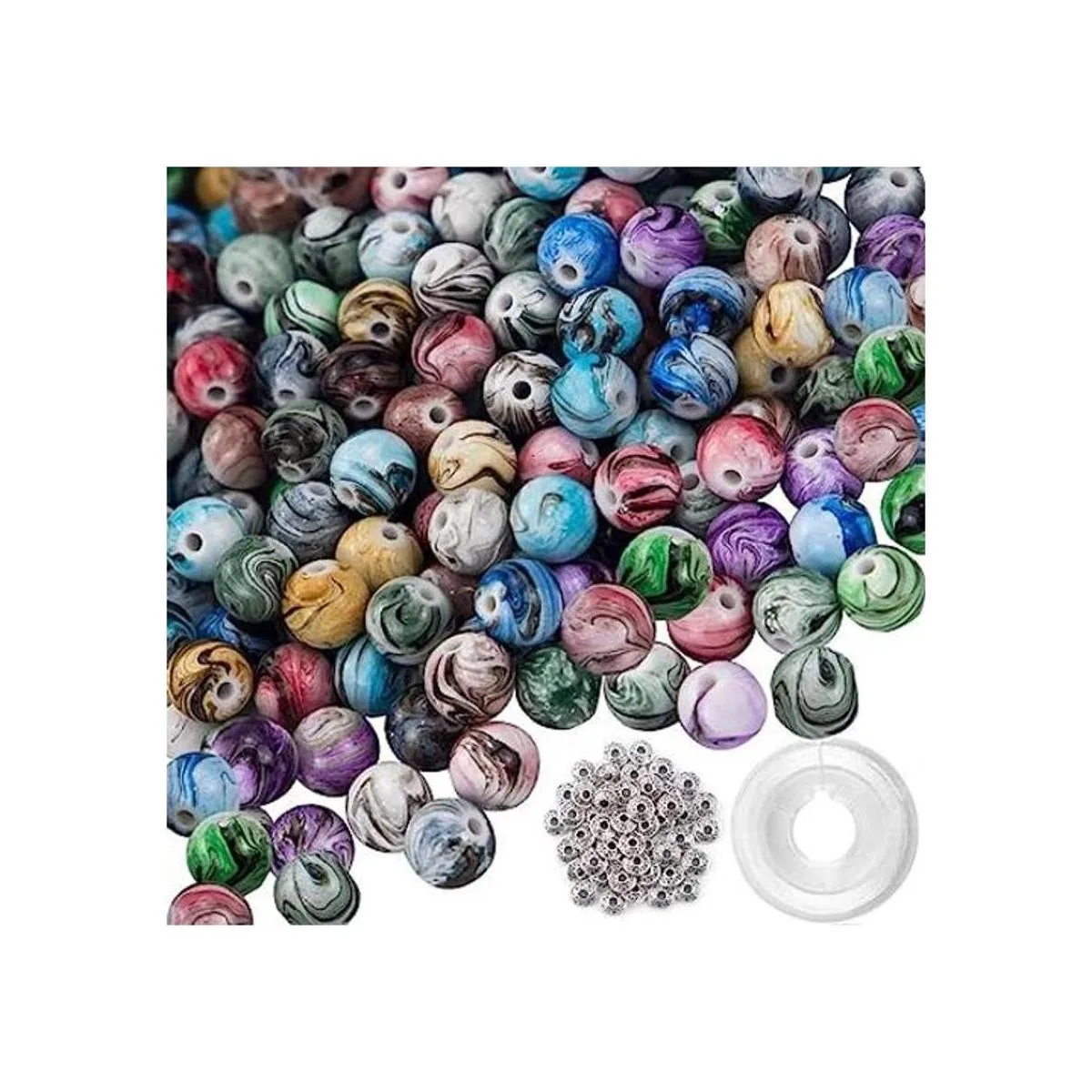 Paquete: incluye 500 cuentas coloridas para manualidades en patrones de tinta y 50 cuentas espaciadoras de plata antigua y 1 rollo de cuerda de cristal.