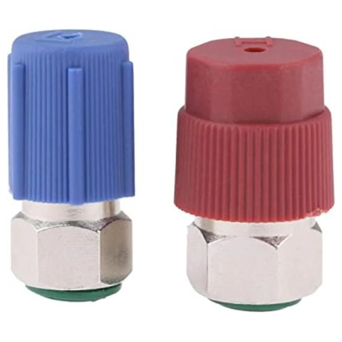 Dimensiones Estos adaptadores/accesorios de lado bajo/alto convertirán tu viejo puerto de carga SAE de 1/4 pulgadas o 7/1620 UNF R12 R22 y harán que acepte la manguera de desconexión rápida R134a. Lado bajo, 1/4 pulgadas 7/16 pulgadas 20 x 0.512 in azul. Lado alto, 1/4 pulgadas 7/16 pulgadas 20 x 0.630 in rojo.