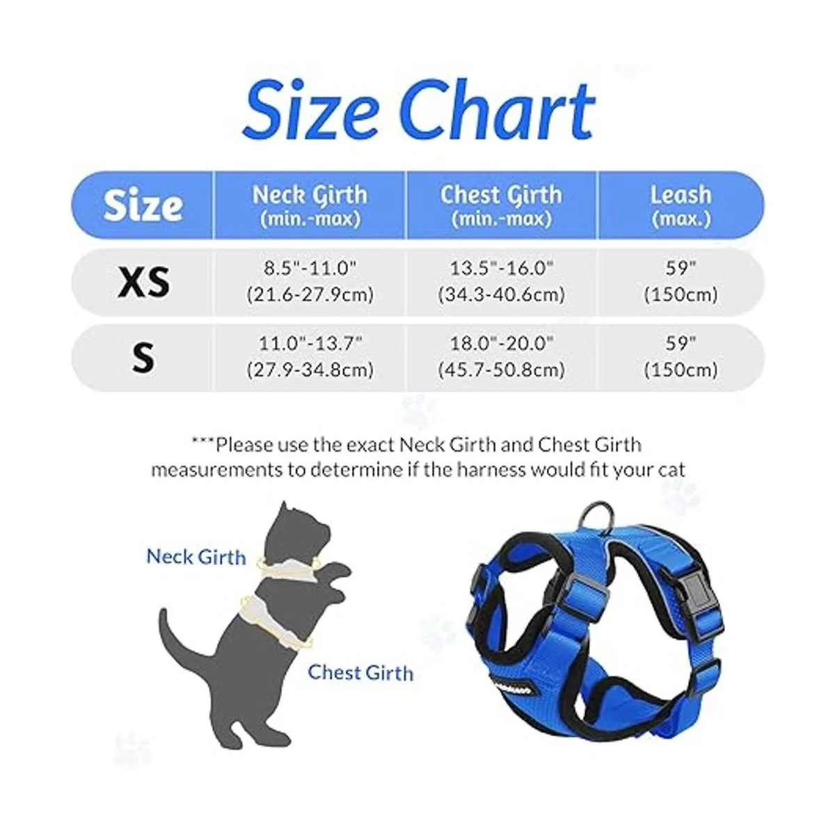 Arnés con correa para el gato adulto promedio: Mide a tu gato cuidadosamente y consulta la tabla de tallas antes de realizar el pedido. Consejos: La circunferencia de la cabeza de tu gato debe medir al menos 25.4 cm 10 pulgadas o tu gato se puede salir. El paquete incluye: 1 chaleco para pasear gatos pequeños y 1 correa de nailon para caminar 150 cm.