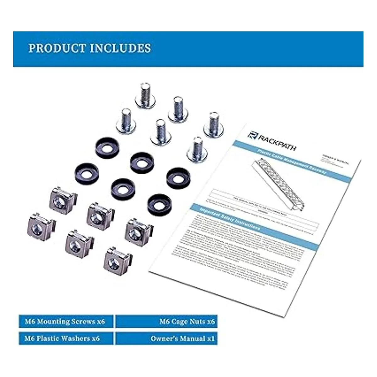 Contenido: 1U de plástico para organizar cables, 6 tornillos M6, 6 arandelas de plástico M6, 6 tuercas de jaula M6