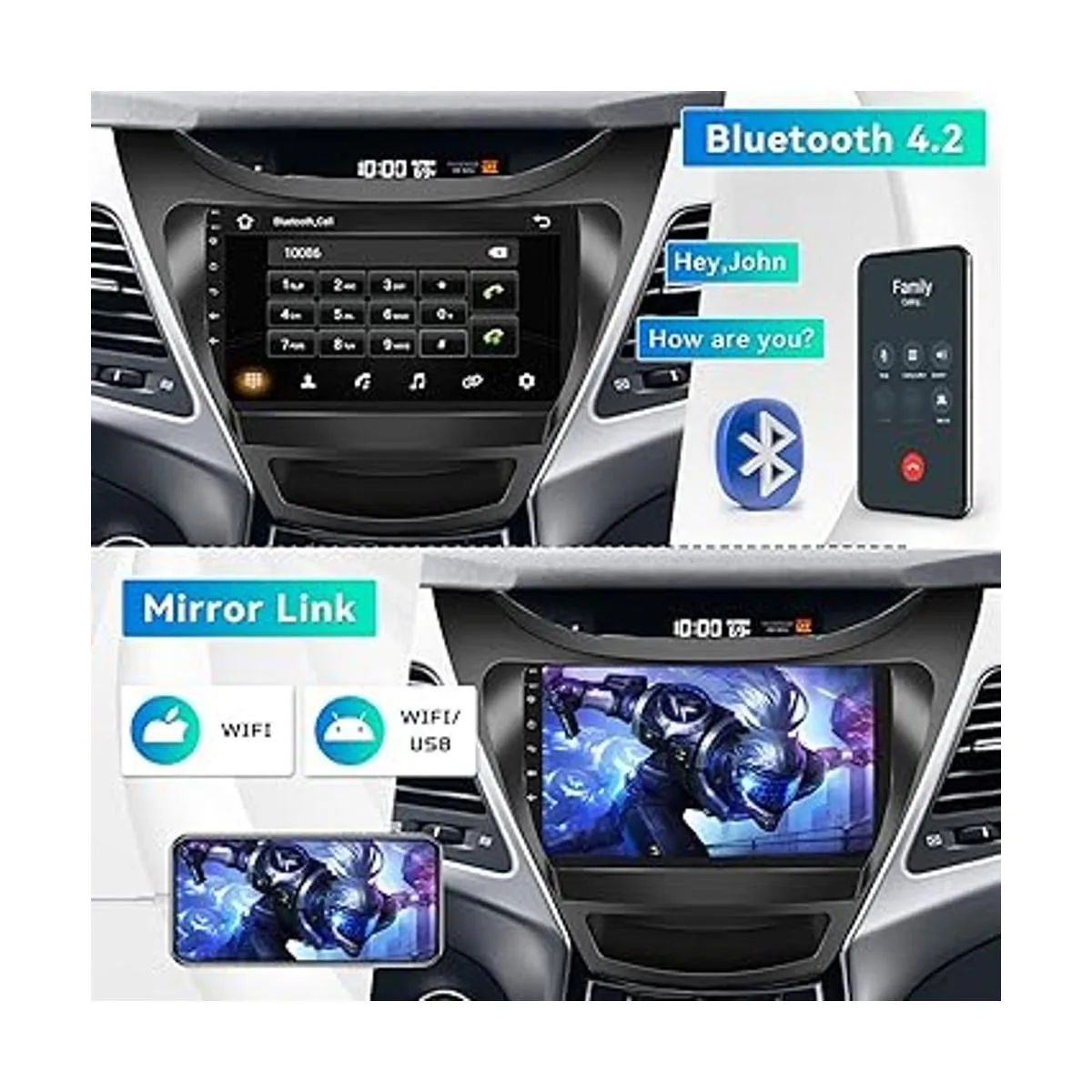 Enlace espejo Función APP: Phonelink para la mayoría de teléfonos Andorid e iOS. Para Android: control bidireccional, para iOS: control unidireccional, la pantalla de tu smartphone se puede reflejar en la pantalla de unidades. Compatible con iPhone y Android sin transferencia de datos