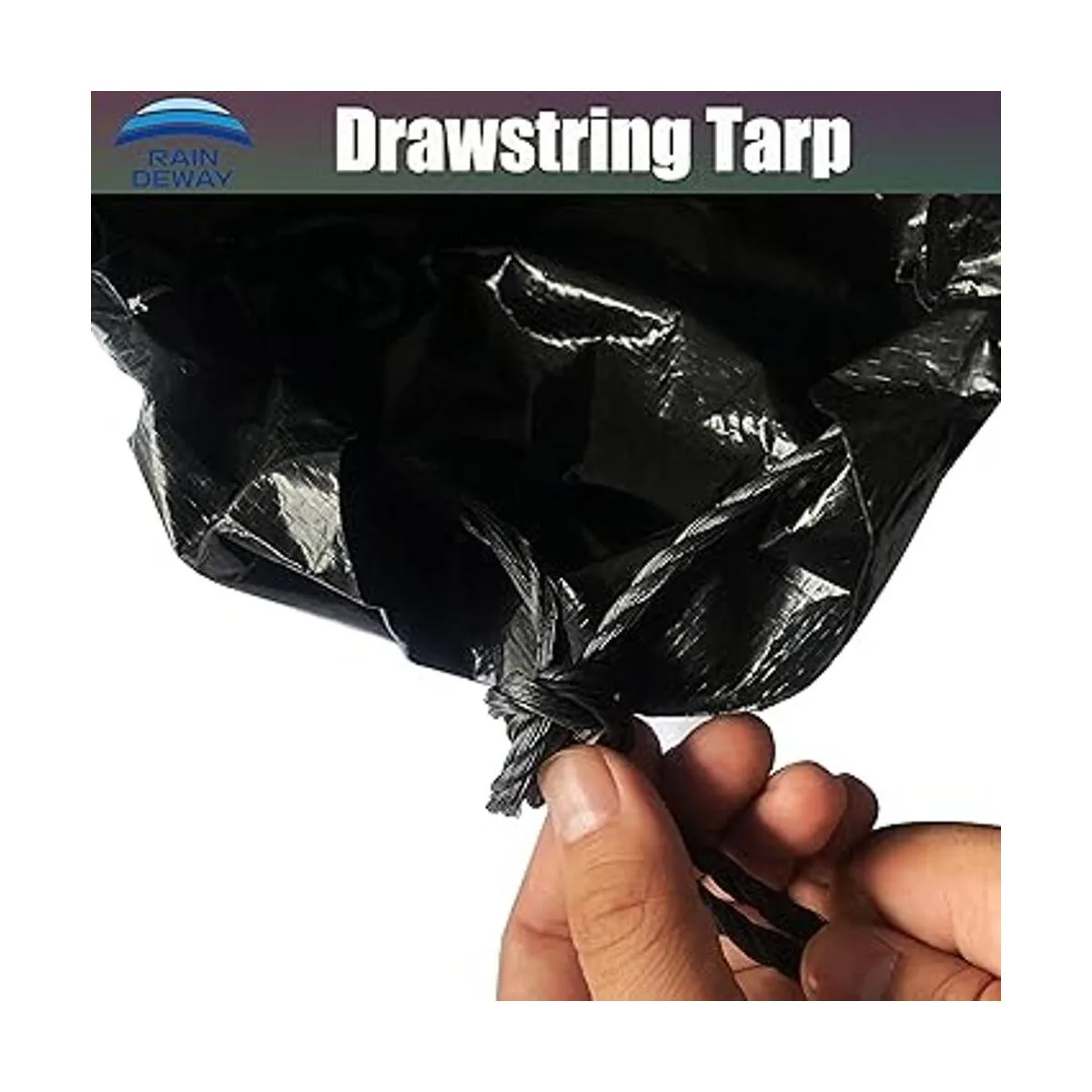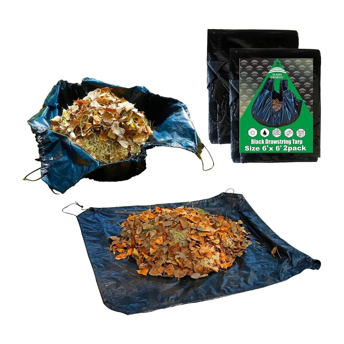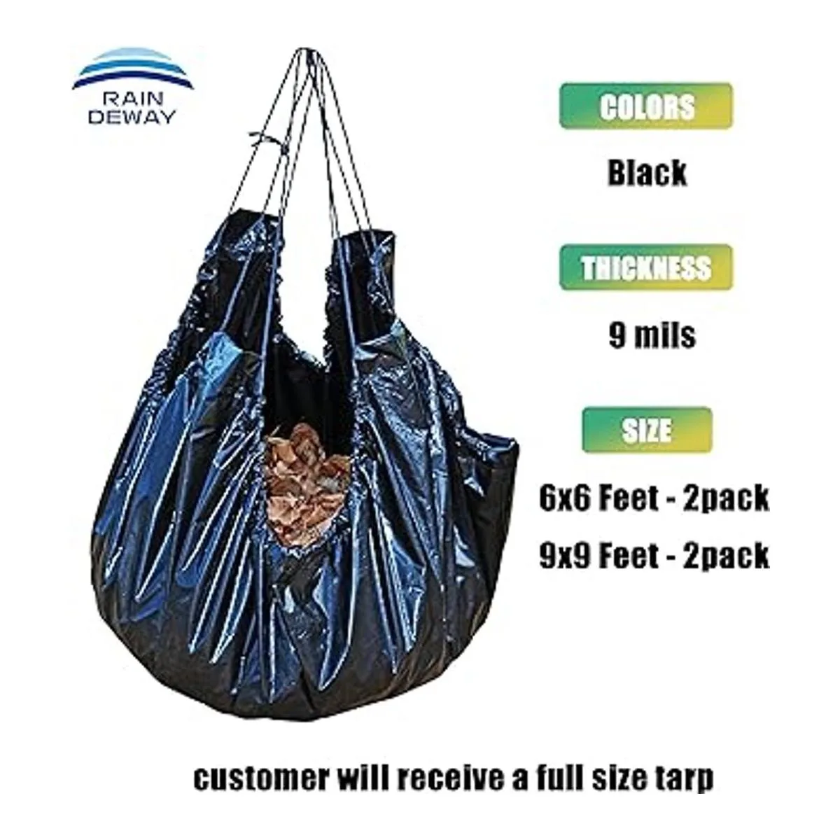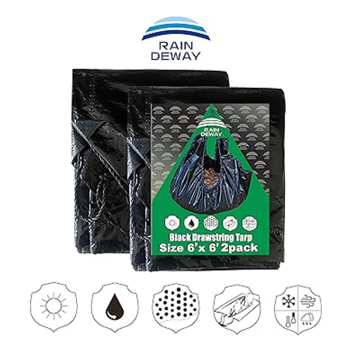 RAINDEWAY Lona con cordón de 6 x 6 pies paquete de 2, lona de polietileno negro de 9 mil con cordón, bolsa de lona reutilizable para jardín de hojas