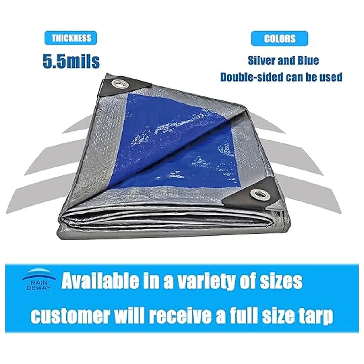 Tamaño acabado: la lona azul y plateada Raindeway es de 5.5 mil de grosor. El tamaño es el tamaño real que se puede utilizar, si eliges lonas Raindeway recibirás una lona de tamaño completo