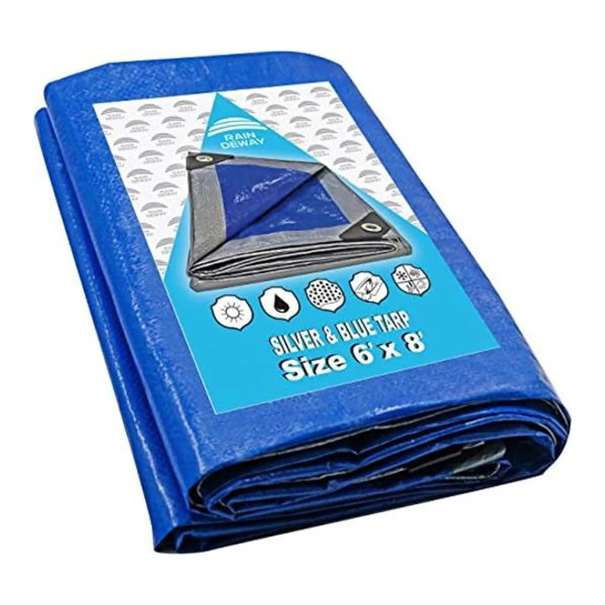 RAINDEWAY Lonas de 6 x 8 pies 5.5 mil, cubierta de lona de polietileno impermeable multiusos con ojales de metal y bordes reforzados, lona plateadaazul