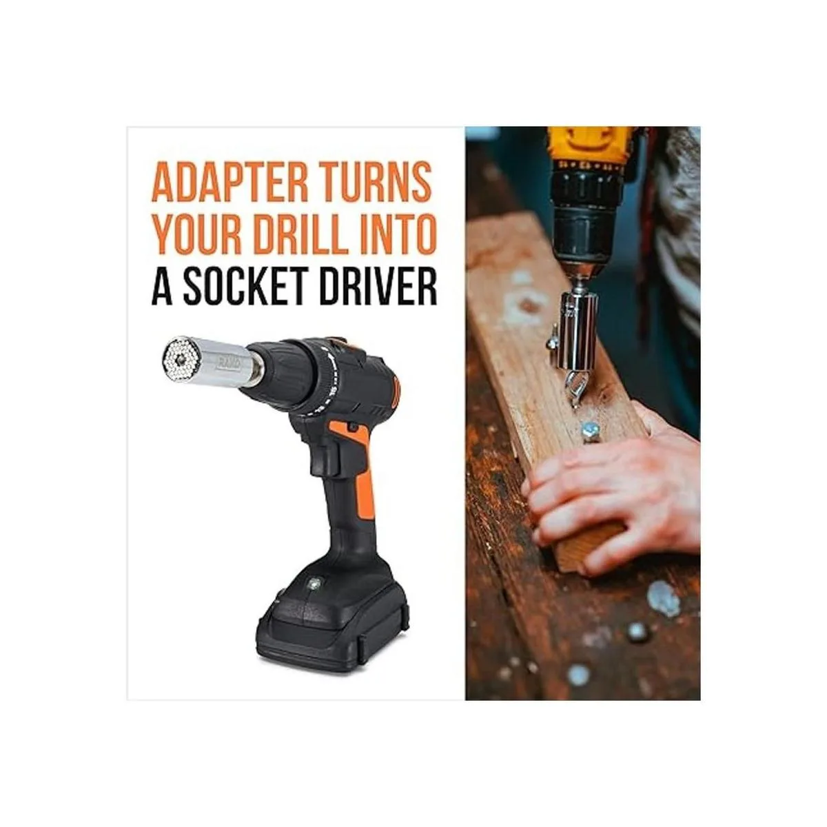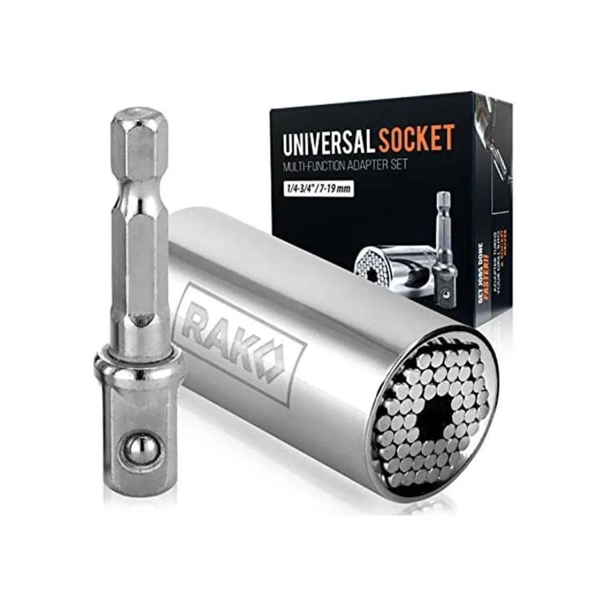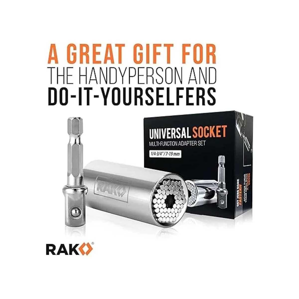 POWER DRILL ADAPTER The RAK 2piece universal socket set also includes a power drill adapter to easily turn any drill or power screwdriver into a power socket driver in seconds.