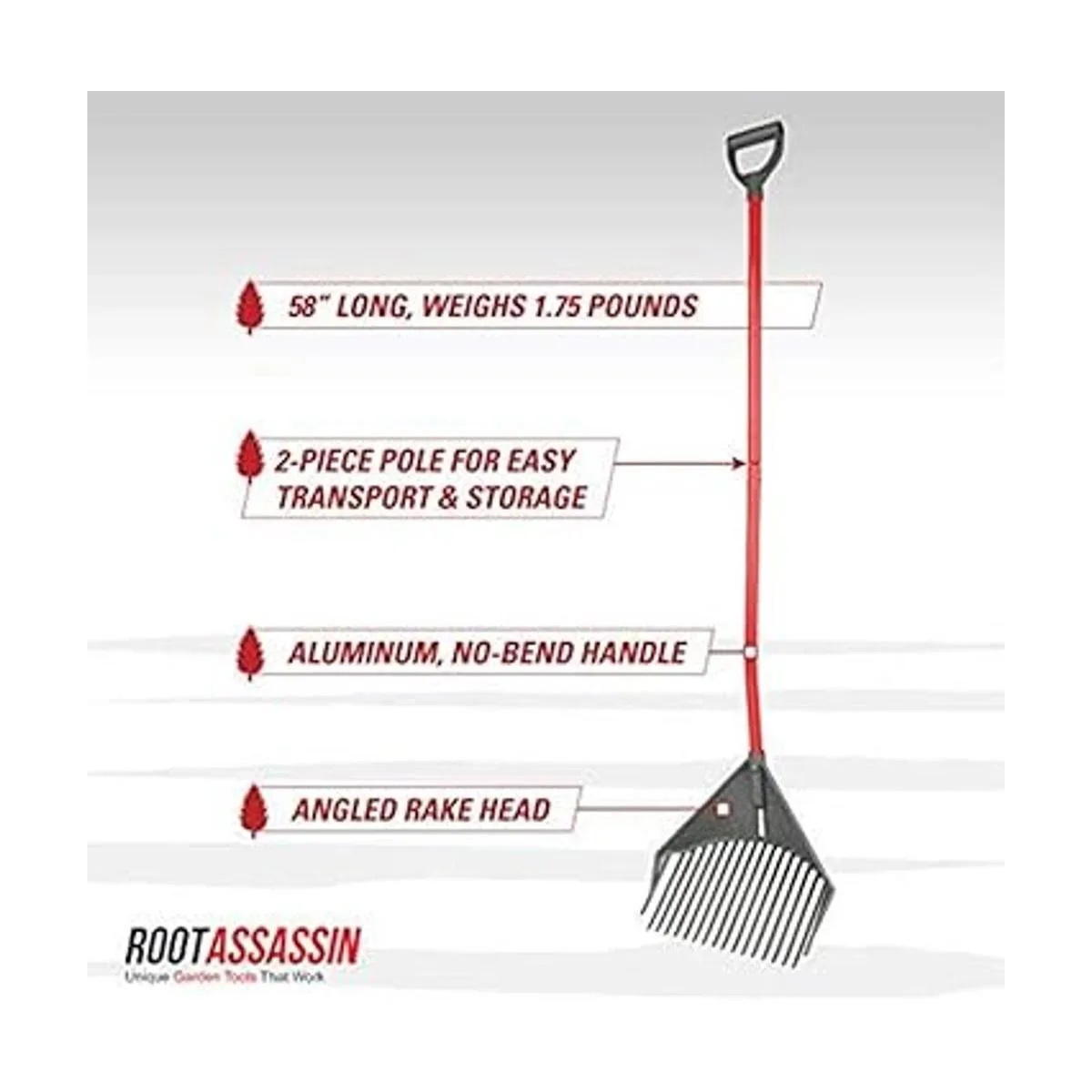 Rastrillo de jardinería Root Assassin que es fiable y fácil de usar; ideal para girar montones de compost, palear frutas caídas o podar recortes, recoger residuos de patio y desnatar piscinas.