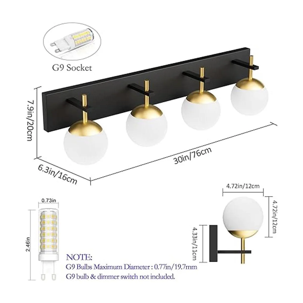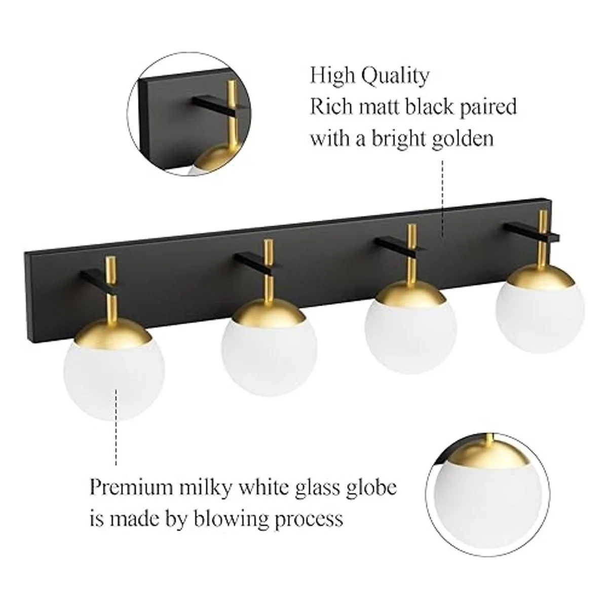 Ralbay Luces de tocador modernas de mediados de siglo para baño, globo de vidrio lechoso de 4 luces, luces modernas de tocador de baño sobre espejo, lámpara de pared de baño negrodorado excluir bombilla