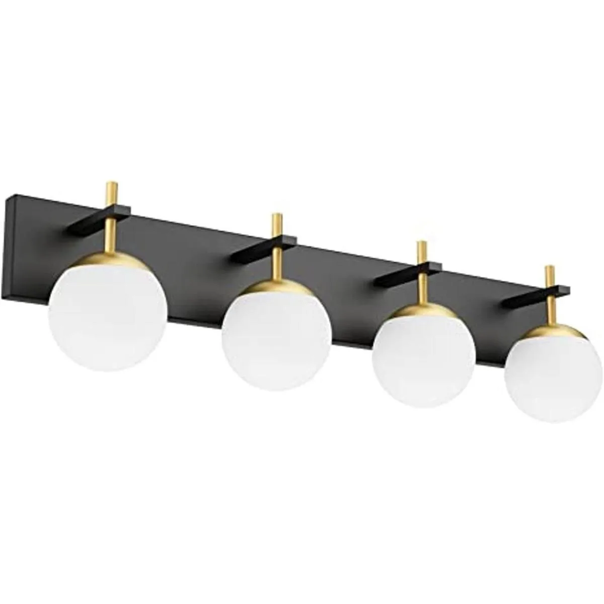 3: Diseño: modernas luces de tocador negras y doradas de mediados de siglo. Metal de alta calidad negro y dorado y una bola de cristal blanco lechoso. Se adapta a una variedad de estilos de diseño que van desde modernos de mediados de siglo hasta diseños limpios contemporáneos.