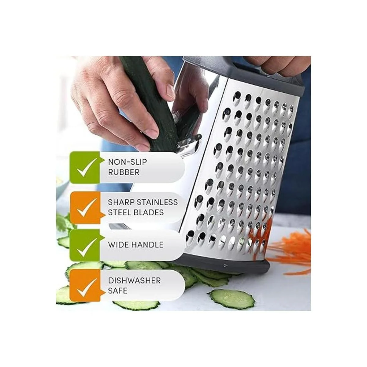 Increíble versatilidad con el diseño de 4 caras: considera deshacerte de todos los otros ralladores y rebanadores que puedas tener para hacer espacio para esto. Rallador grueso, rallador medio, rallador fino, rallador e incluso un rebanador, todo en una herramienta práctica. Prepara rápidamente una variedad de alimentos como queso, patata, calabacín, zanahorias, limones y pepinos. Multifuncional con un mango cómodo que te da un control total.