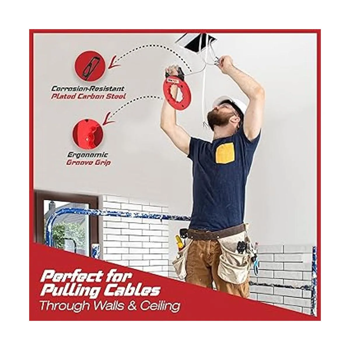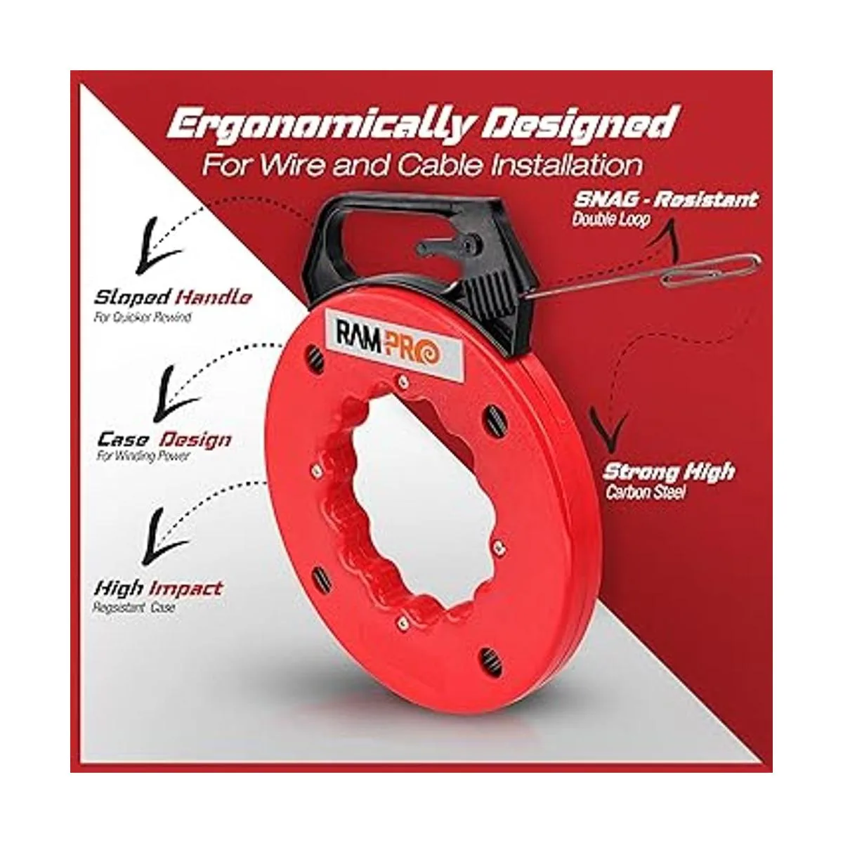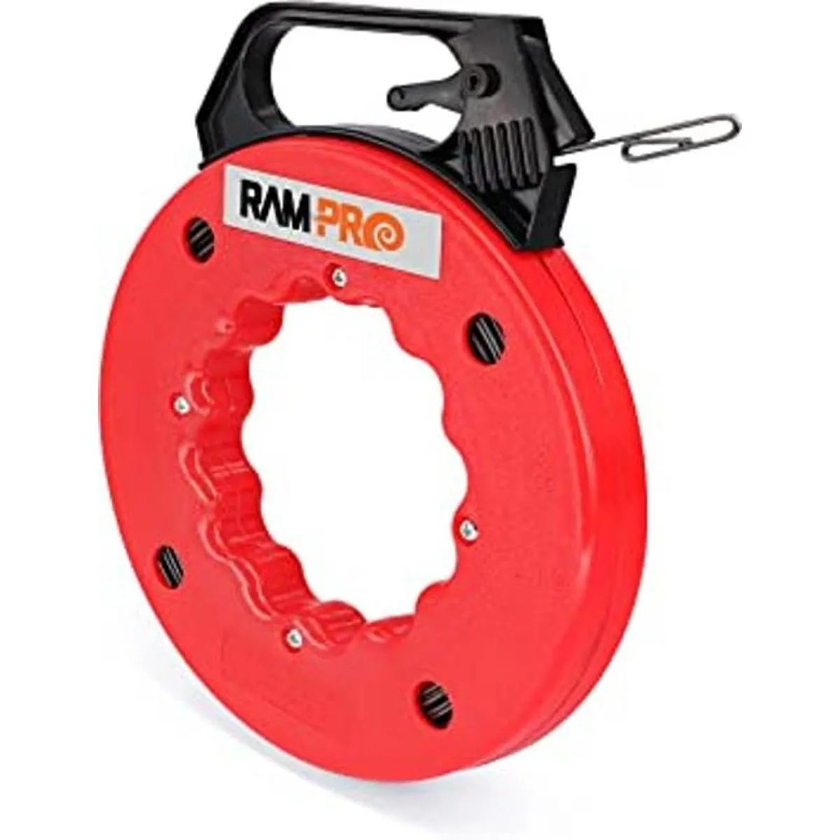 RamPro Cinta de pescado, extractor de alambre eléctrico, herramientas de pesca de alambre con punta de doble bucle, cinta de acero flexible, carcasa duradera de 18 x 50 pies
