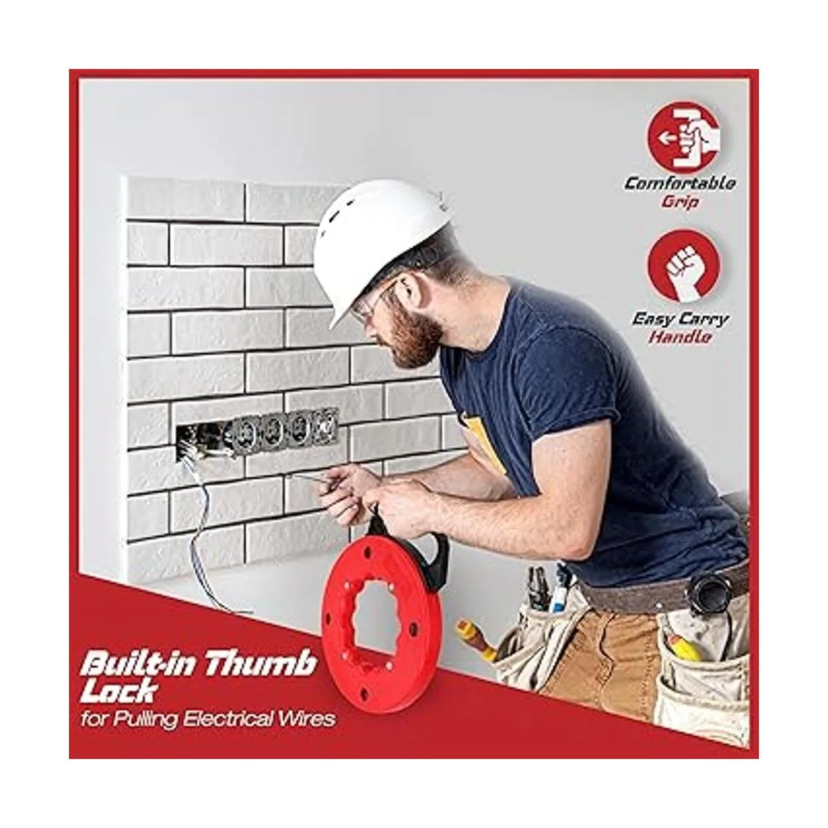 Consigue un agarre Mango de agarre cómodo mejorado y bloqueo de pulgar integrado en nuestra cinta de peces de 1/8 pulgadas x 50 pies hace que tirar de cables eléctricos o de comunicación sea fácil sin enredarse
