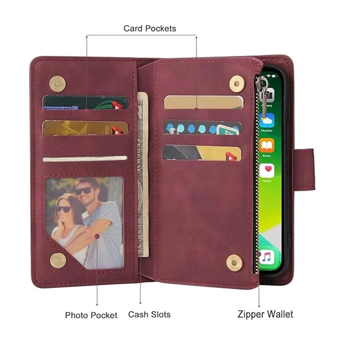 Funda tipo cartera 2 en 1: con 5 ranuras para tarjetas, una ranura visible para identificación y bolsillo con cremallera para dinero. Puedes llevar tus tarjetas de identificación, tarjetas de crédito/débito, liscenario de conductor, varios dinero en efectivo y pequeñas notas sin tener que llevar tu voluminosa cartera contigo.