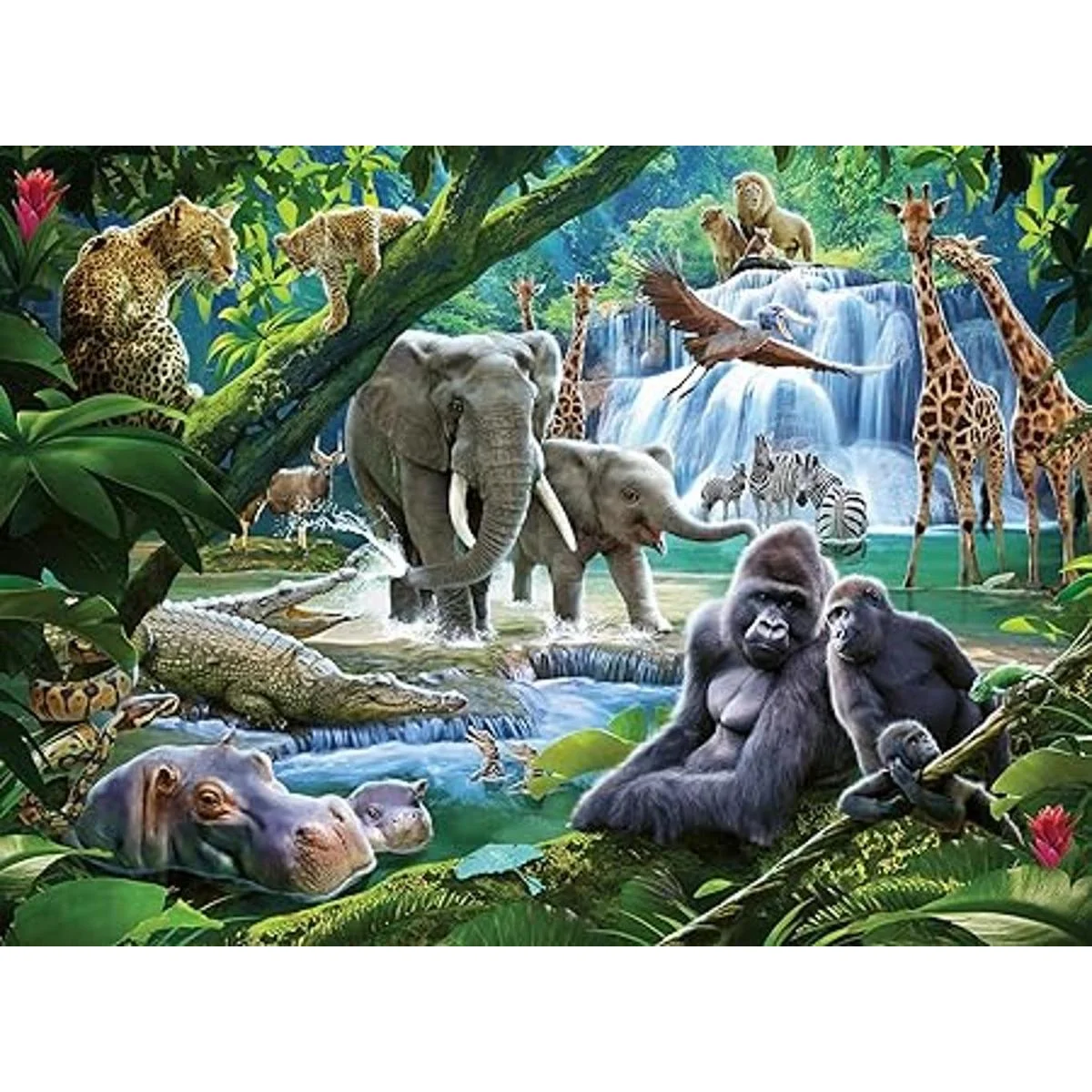 Acerca de este rompecabezas de 100 piezas Bienvenido a Friendship Falls, donde nuestros animales de la selva viven en paz y armonía