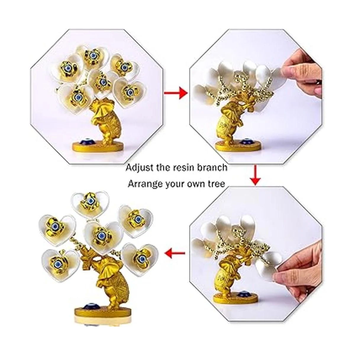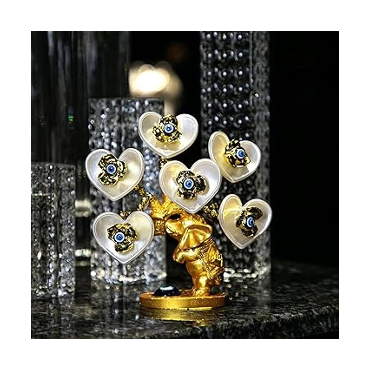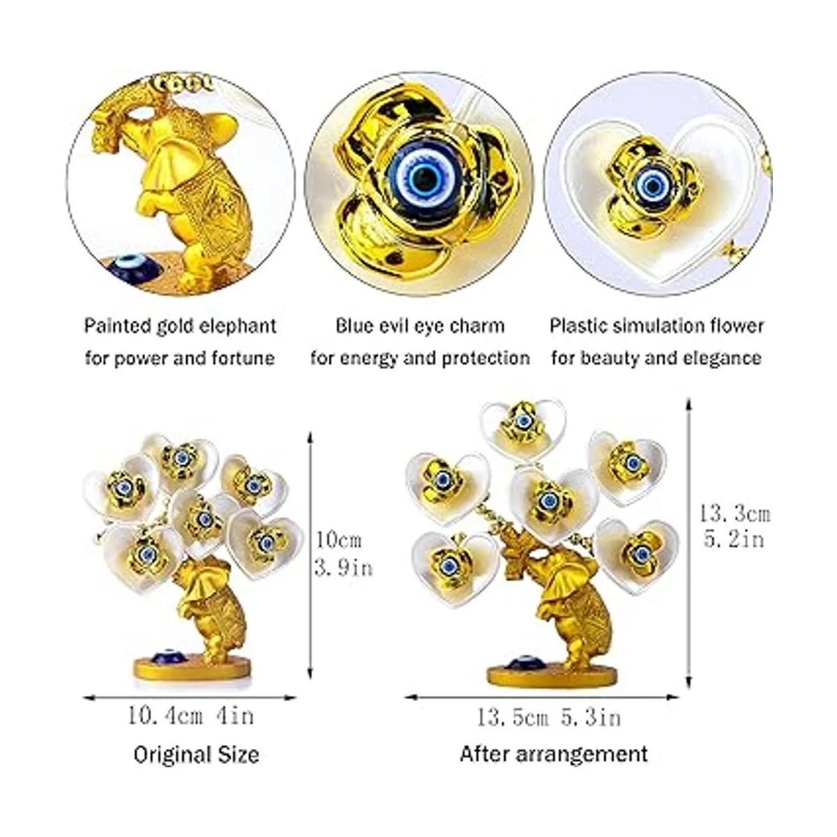 rbol de dinero de ojo malvado azul con figura de elefante dorado pintado, flores artificiales blancas, decoración de protección para el hogar, oficina, adorno de Feng Shui