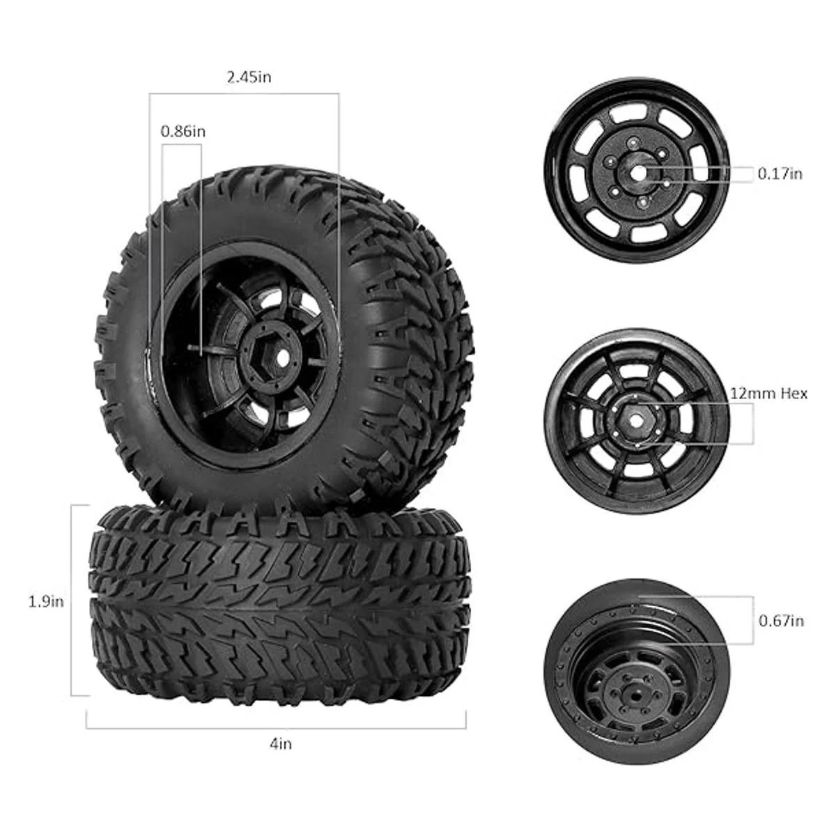 Tamaño de las ruedas y neumáticos a control remoto: el tamaño de nuestros neumáticos todoterreno 1/10, diámetro interior: 2.453 in, diámetro exterior: 3.937 in, ancho: 1.906 in, tamaño hexagonal: 0.472 in. Asegúrate de que nuestros neumáticos y ruedas RC son del tamaño correcto que estás buscando, para evitar las devoluciones de productos y ahorrar tiempo debido al tamaño inconsistente.