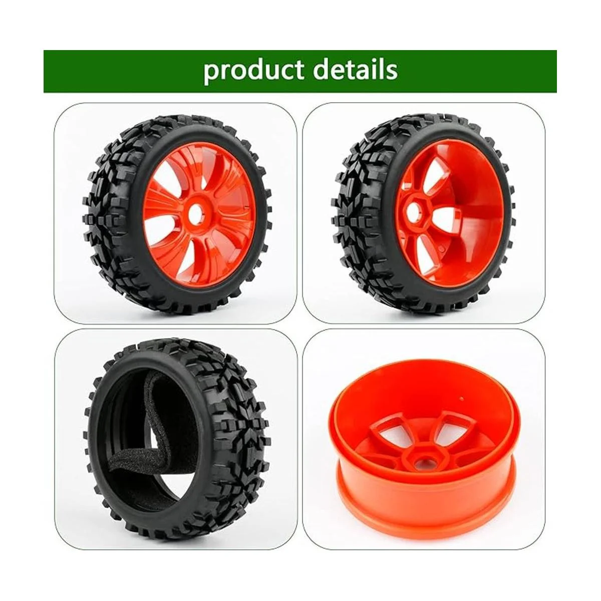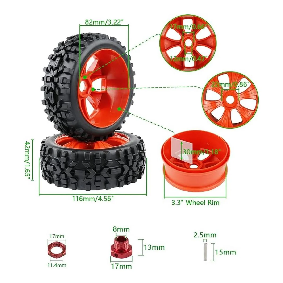 Hecho de neumáticos de goma con inserto de espuma, llanta de plástico; patrón agresivo de banda de rodadura ofrece un buen agarre y tracción en todo terreno, césped, barro, suciedad suelta, arroyos y algunas rocas de pizarra, etc.