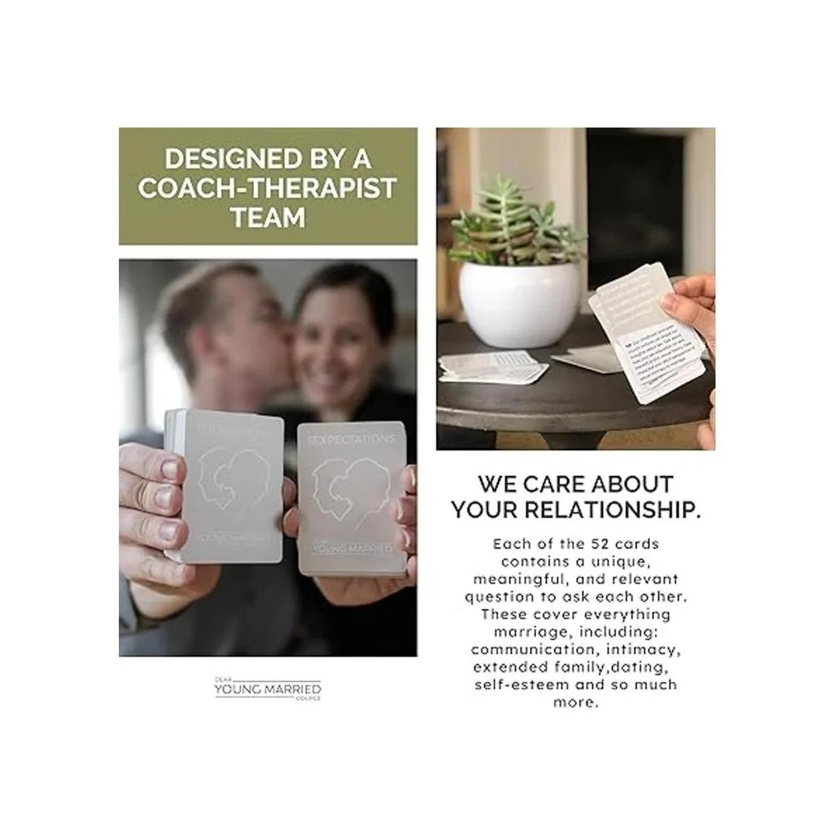 Conéctate más íntimamente con tu socio: diseñadas y creadas por el equipo de entrenadores y terapeutas, DearYoungMarriedCouple, estas tarjetas nacieron de años de experiencia en asesoramiento. Adam y Karissa King han ayudado a miles de parejas a sanar, conectarse más, aventurarse y encontrar un propósito.