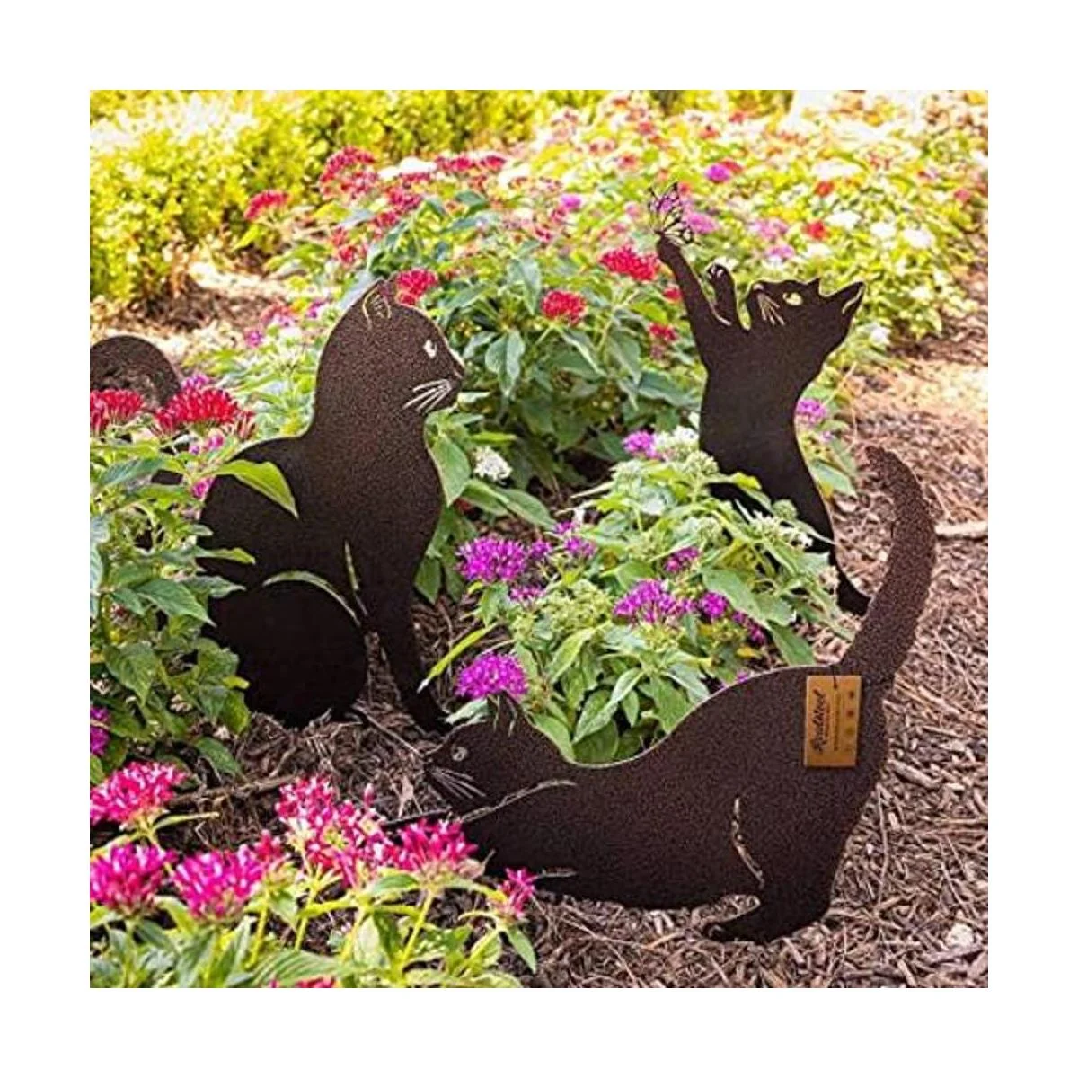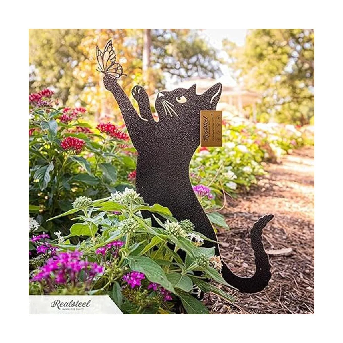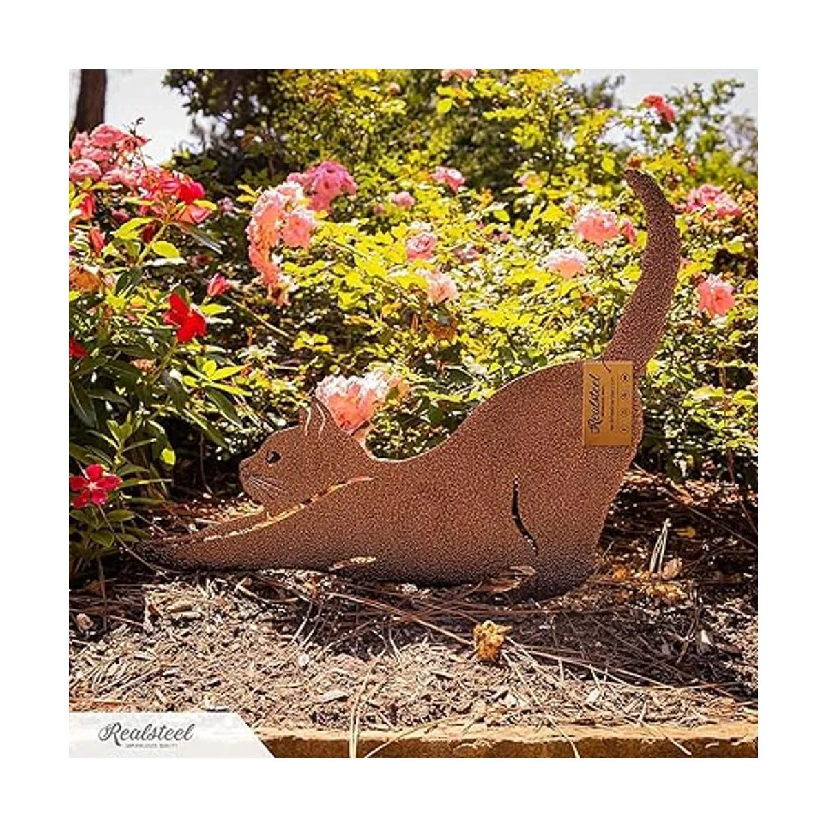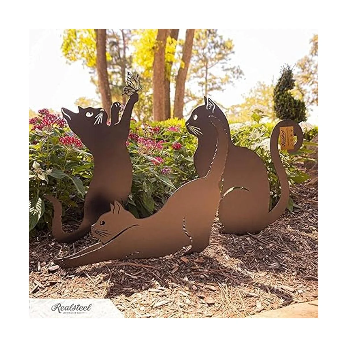 De buen gusto y simple: acero resistente y fabricado en Estados Unidos bellamente hecho a mano en diseños llamativos con precisión y habilidad, esa es la especialidad de RealSteel y nuestro paquete de 3 gatos no es una excepción. Te permite mostrar tu creatividad de paisajismo con un toque elegante y simple. Tu patio delantero irradia calidez con estos acogedores gatitos.