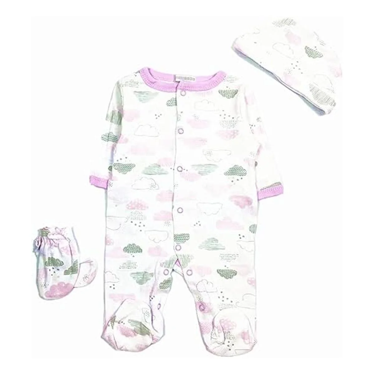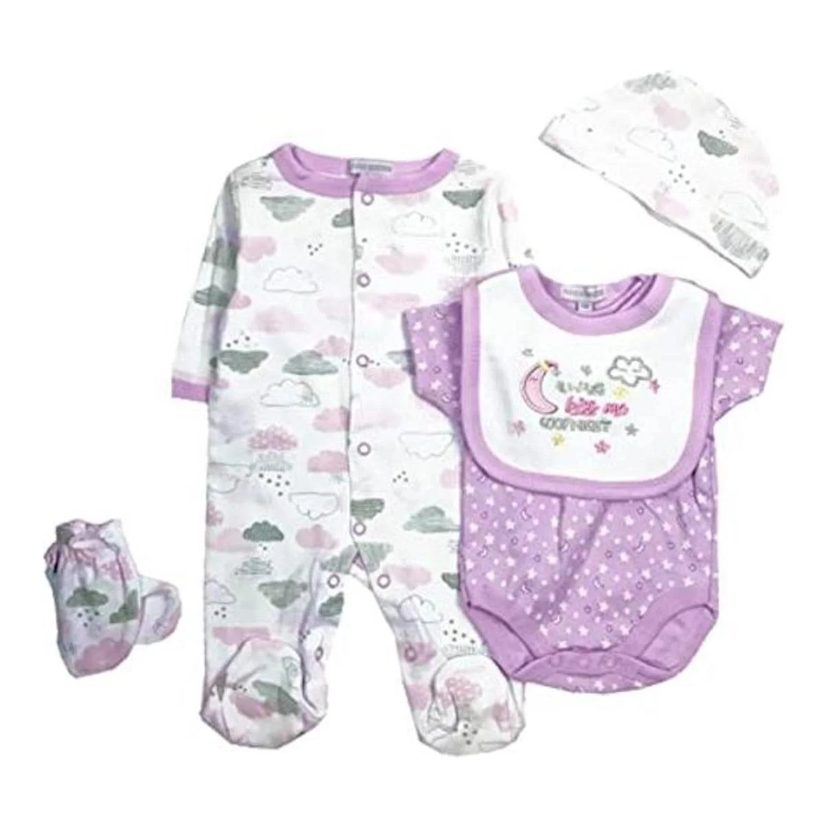 El juego de 5 piezas incluye: 1 babero, 1 sombrero, 1 guantes, 1 body largo, 1 body corto.