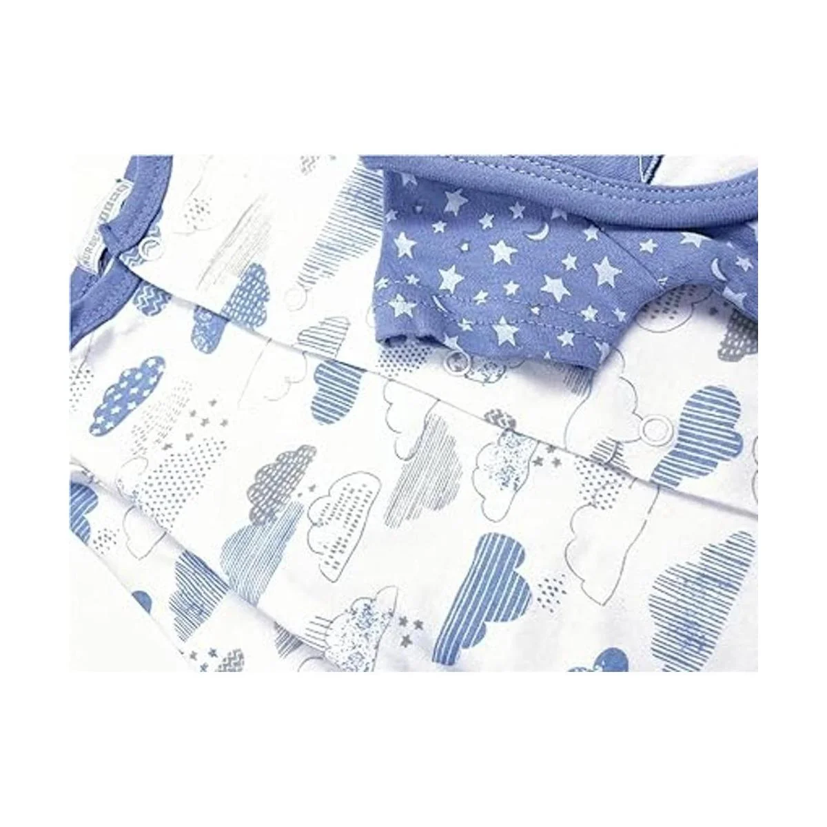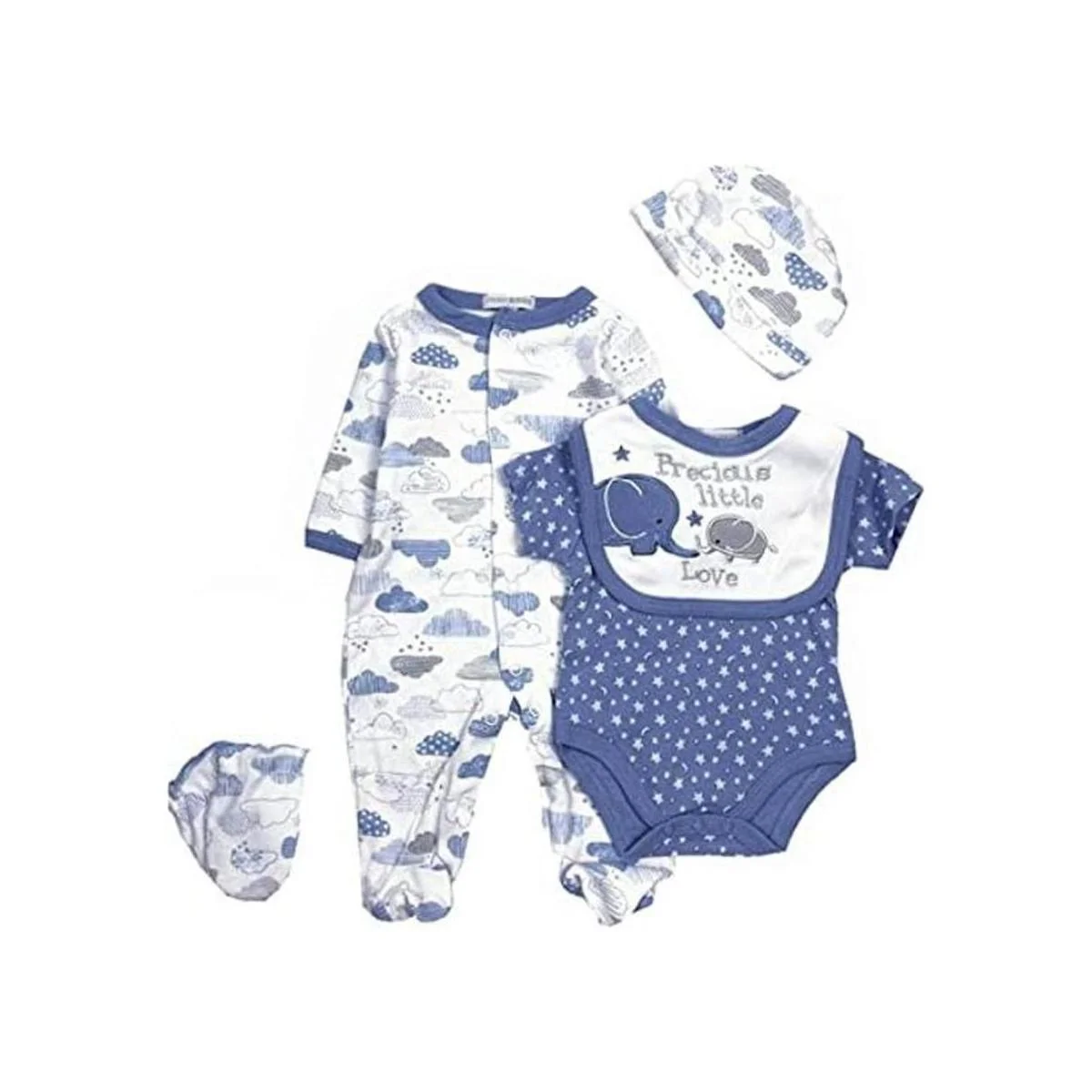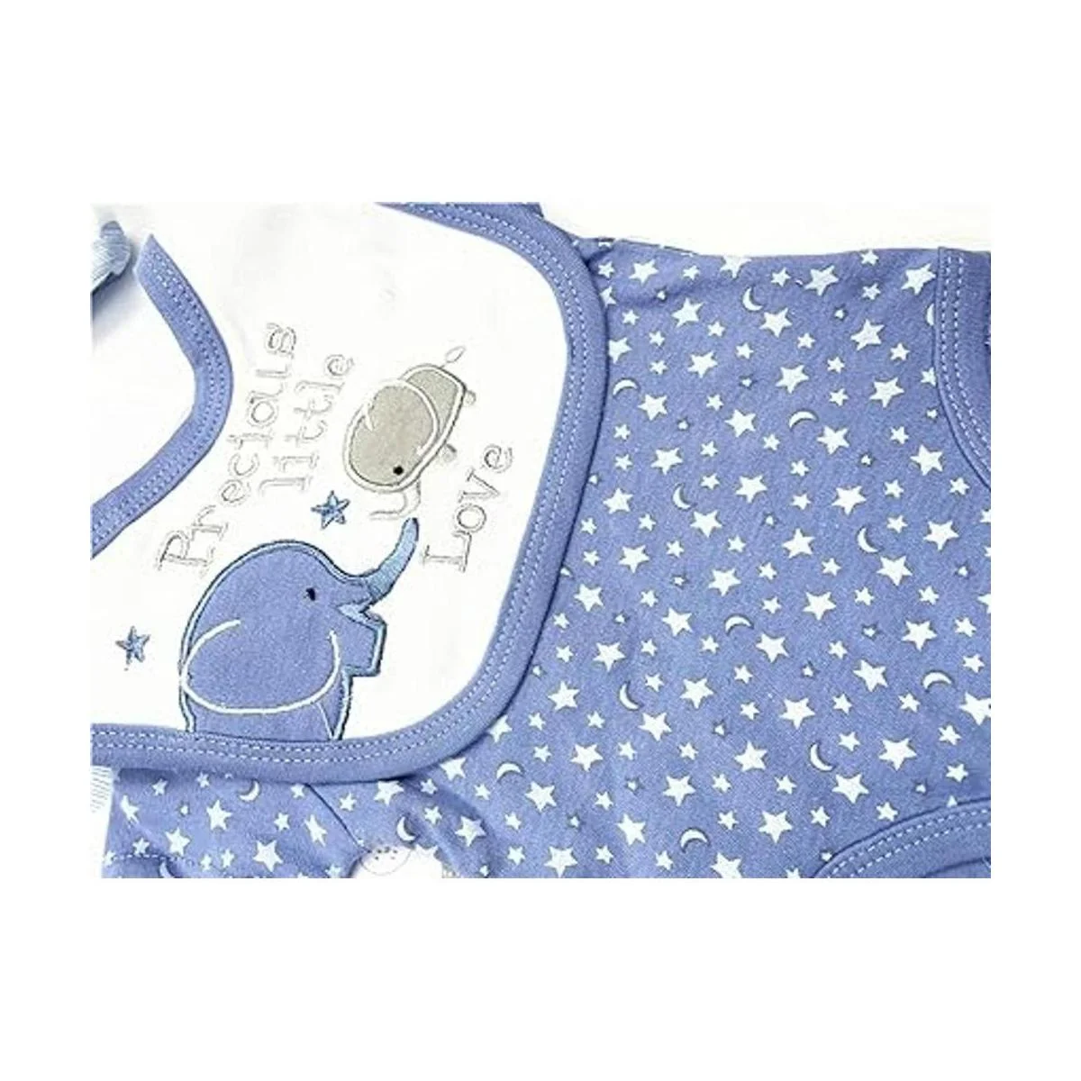 El juego de 5 piezas incluye: 1 babero, 1 sombrero, 1 guantes, 1 body largo, 1 body corto.