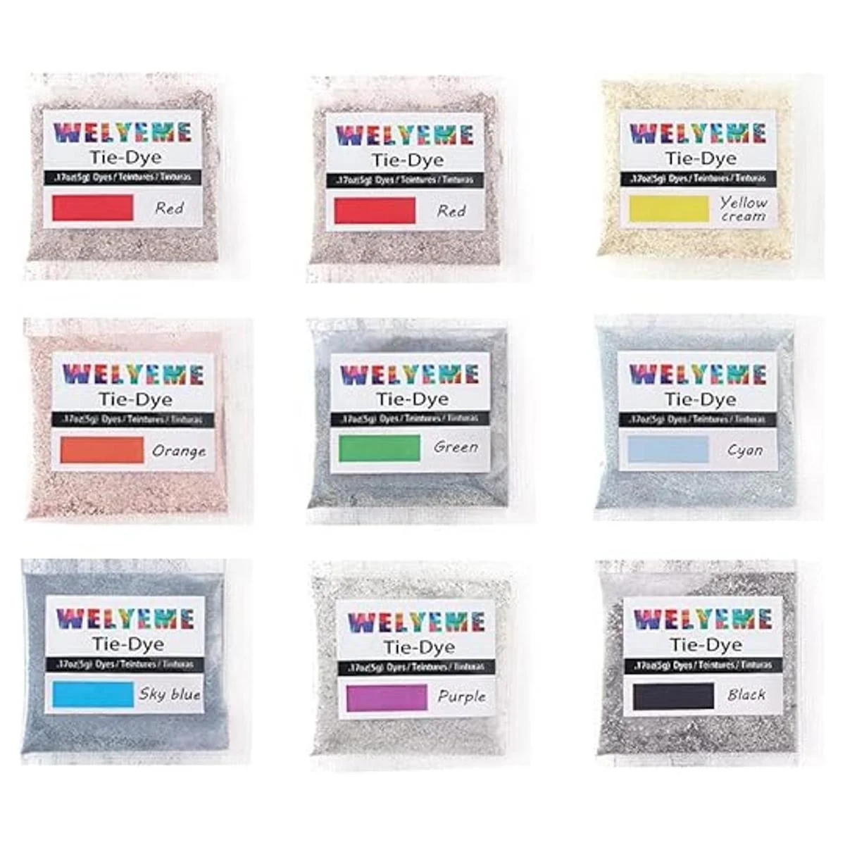 Juego colorido con suministro: este tinte de tela incluye rojo, amarillo, naranja, verde, cian, azul ciano, morado y negro en un total de 9 paquetes de tinte en polvo.