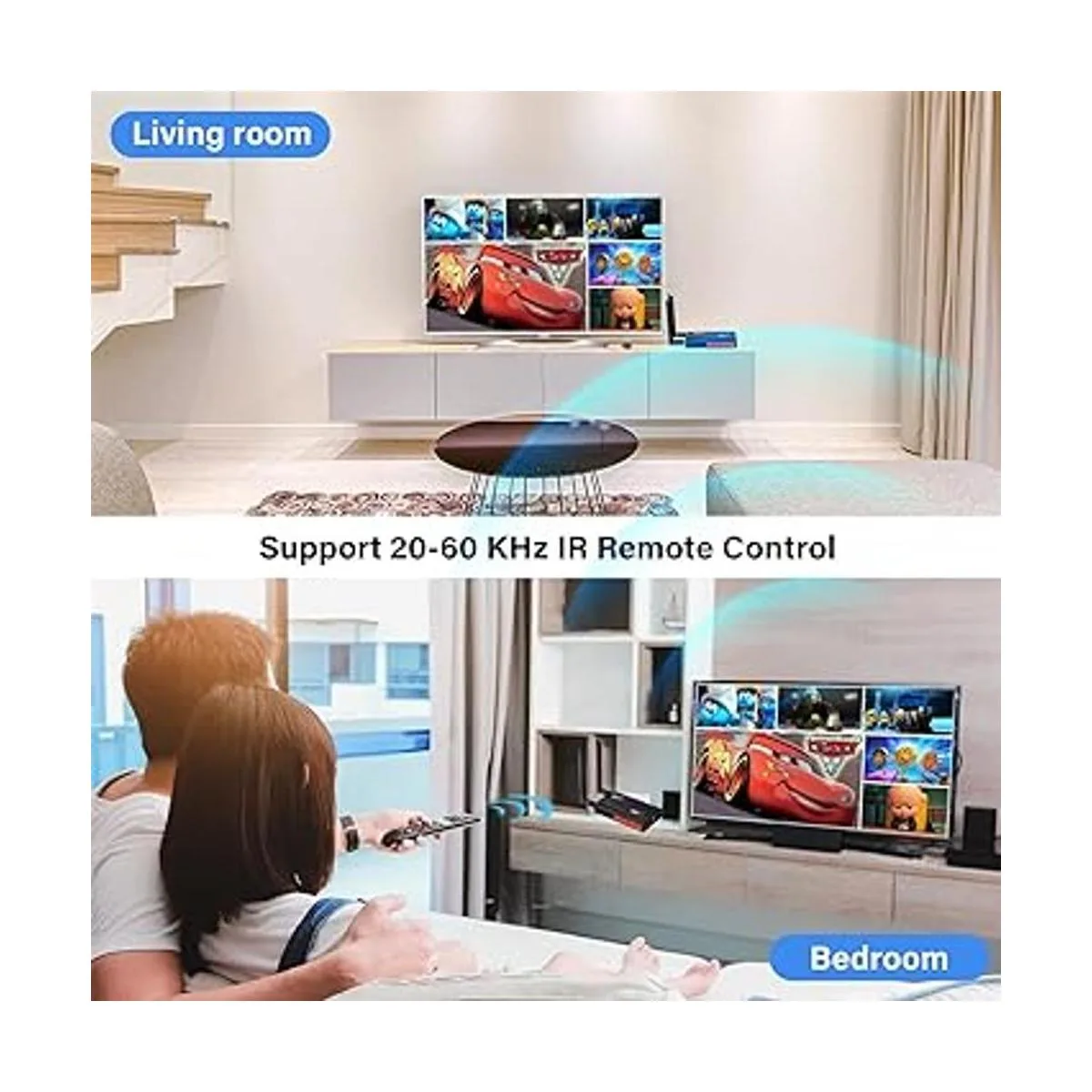 Función de divisor inalámbrico: sincronización de audio de retorno infrarrojo de transmisión HD, distancia de transmisión de hasta 656.2 ft Nota: entorno sin barreras, soporta 1 TX hasta 4 RXs Max, 1TX a 1RX 656.2 ft, 1TX a 2RX 196.9 ft, 1TX a 3RX 98.4 ft, 1TX a 4RX 65.6 ft. .