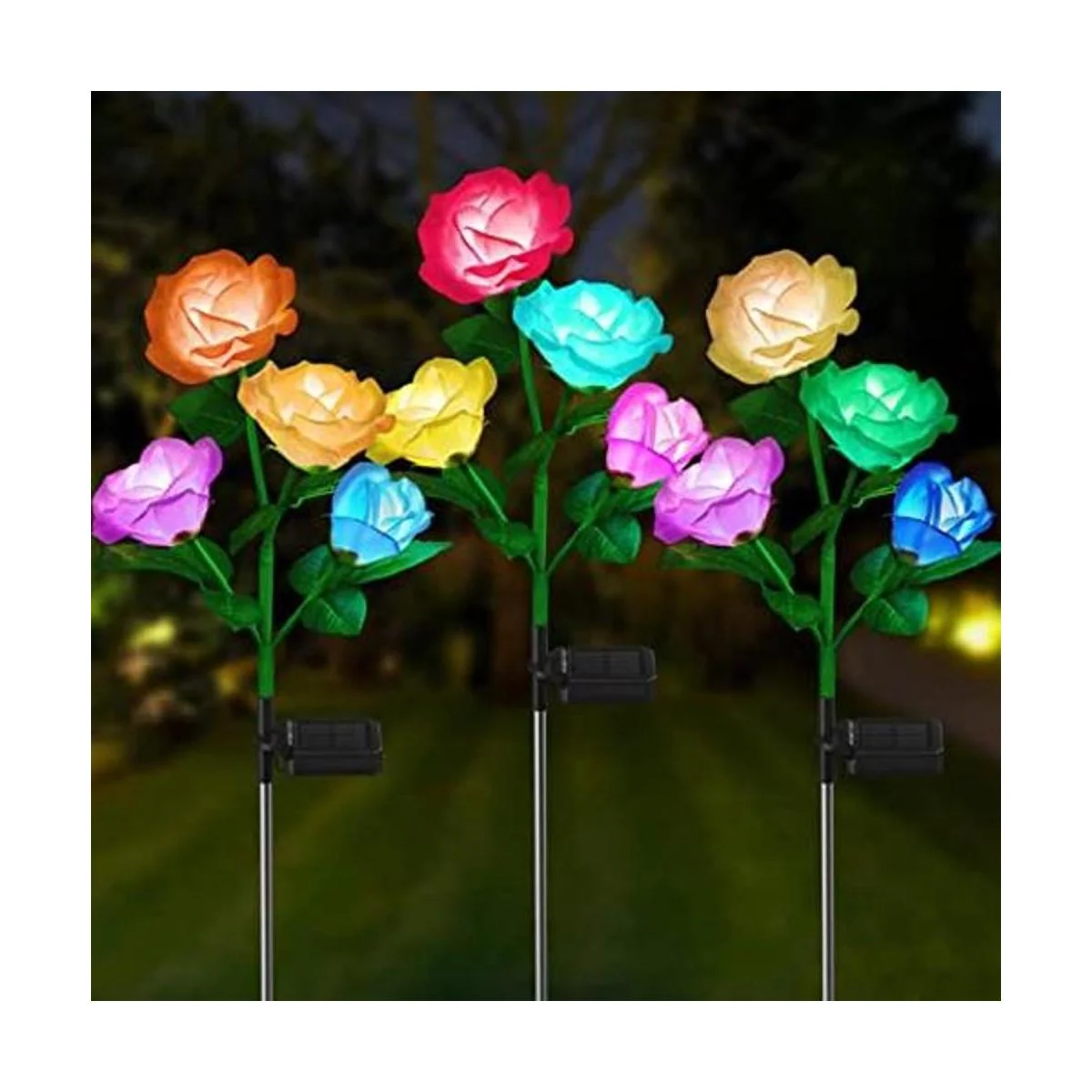 RECHOO Luces solares de jardín decorativas para exteriores, paquete de 3 luces solares de jardín con 12 rosas de flores, multicolor, LED que cambian de color, impermeable, funciona con energía solar, decoración de jardín para patio, decoración de caminos