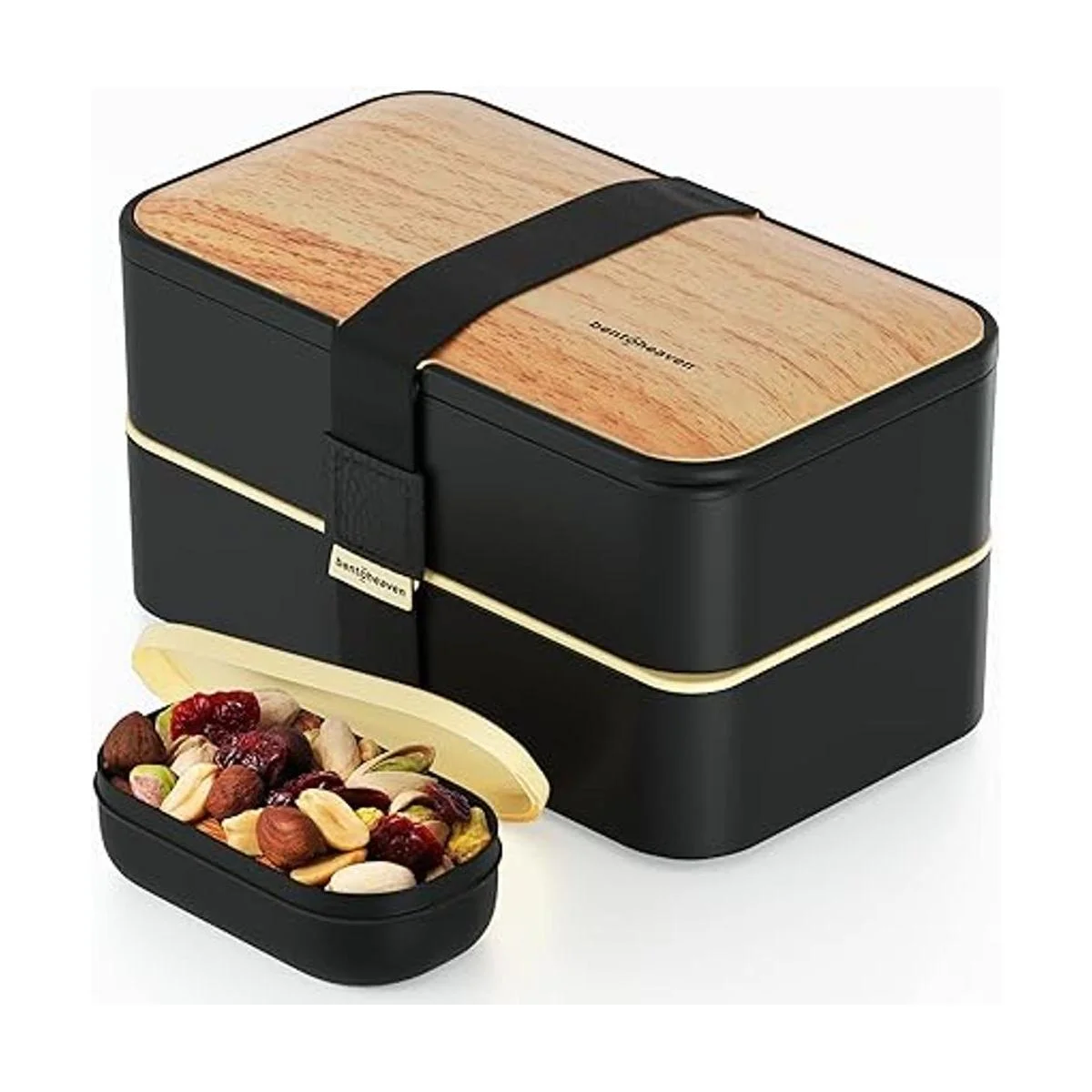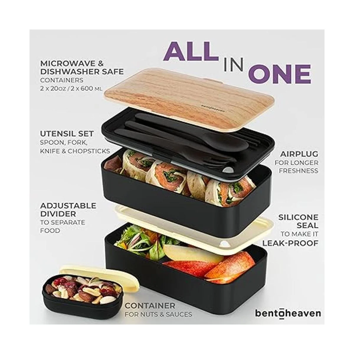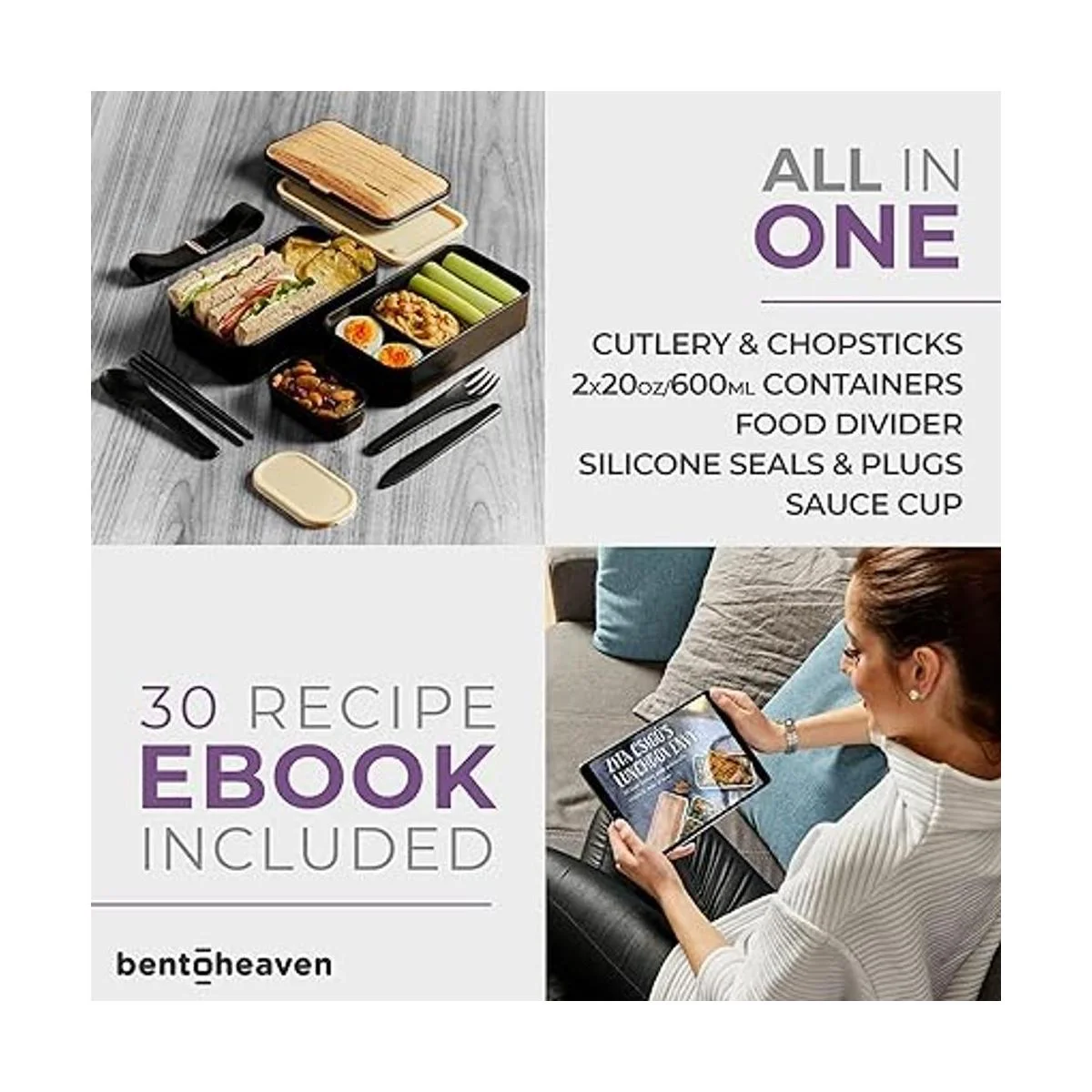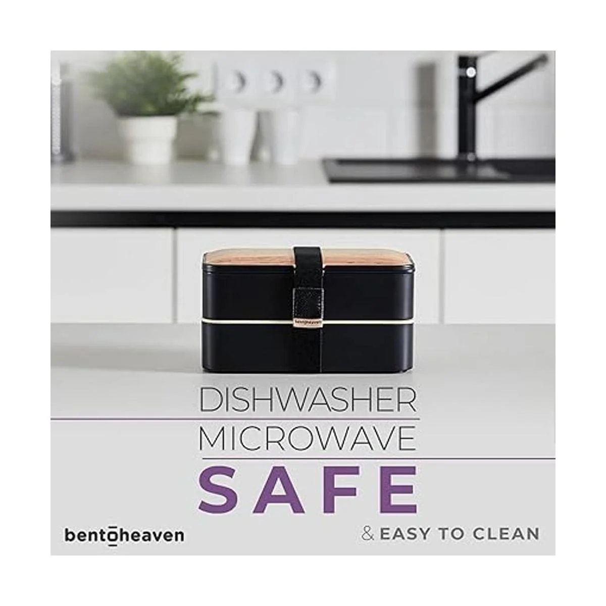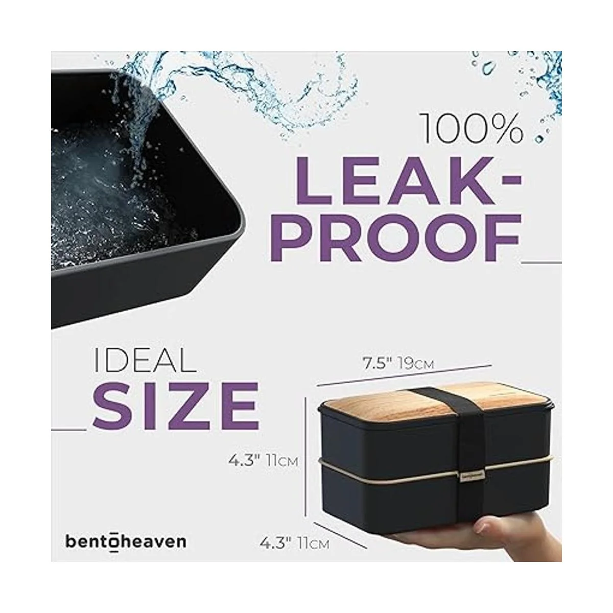 Recipiente para alimentos reutilizable de calidad prémium a prueba de fugas Bento Box de BentoHeaven, para adultos y niños en 4 opciones de color. Cubiertos y palillo gratis. Notas para caja de almuerzo imprimibles gratis., negro Bamboo Black