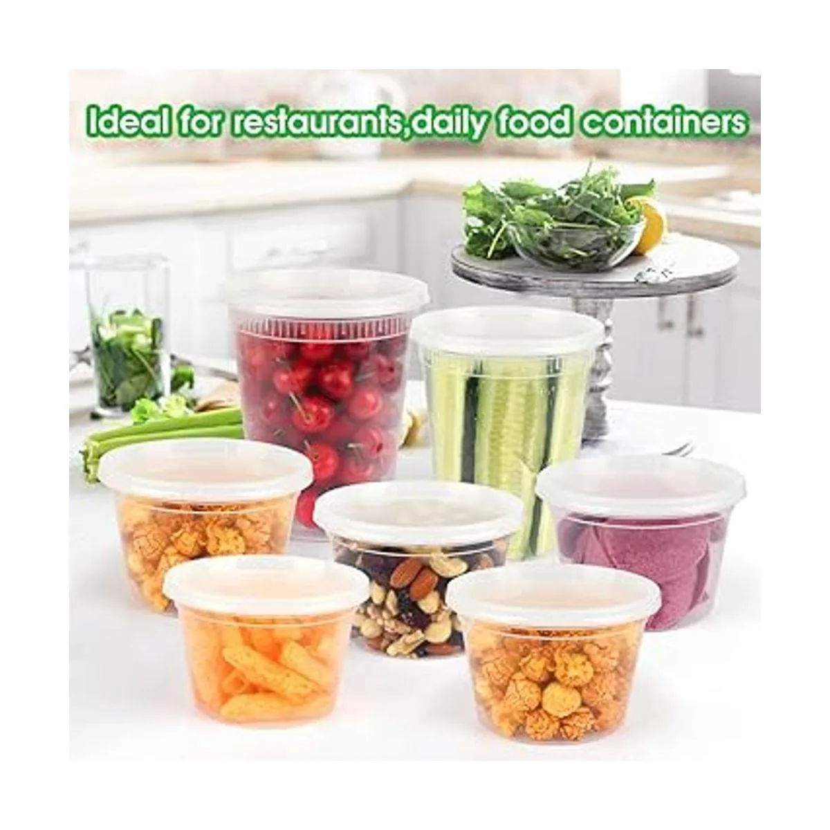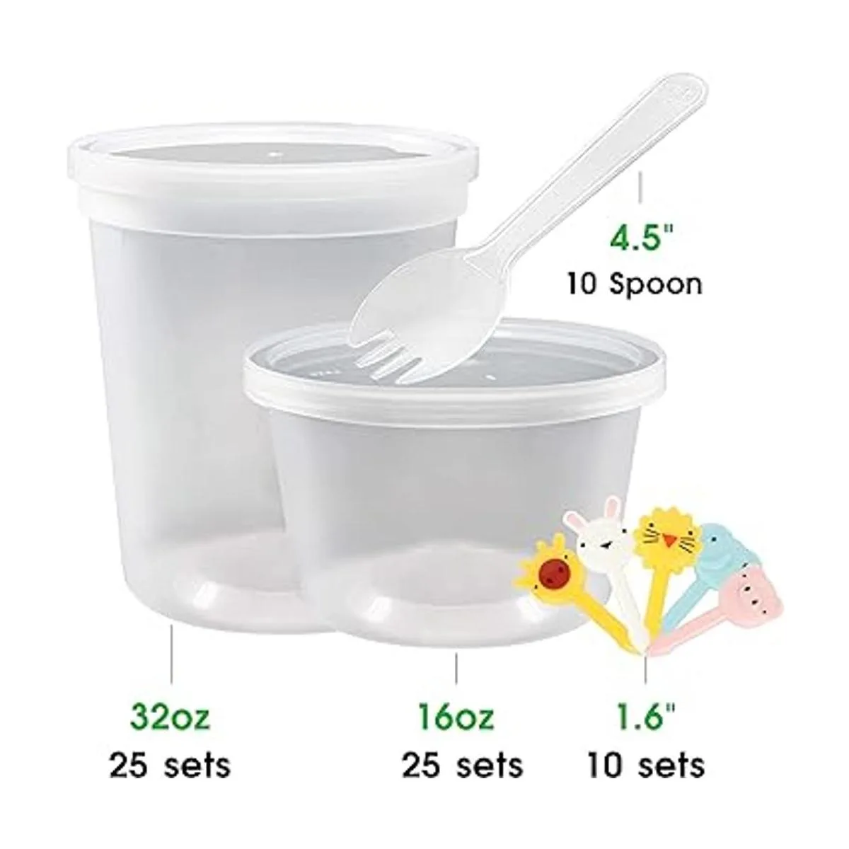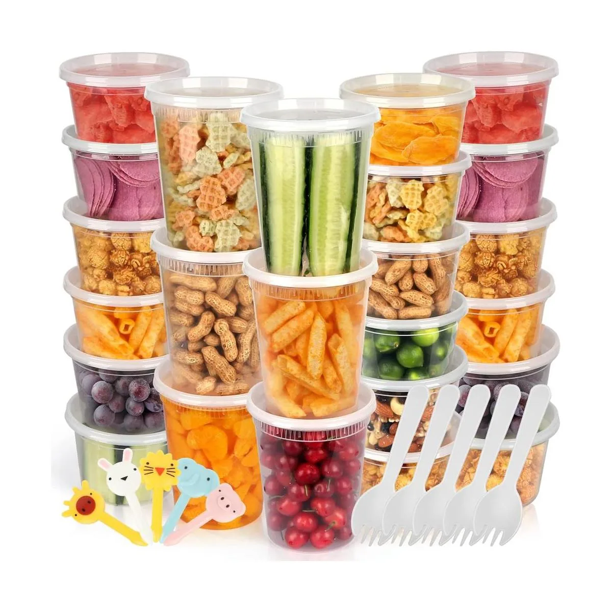 Paquete a granel de 50 20 juegos: paquete con 2 tamaños 50 recipientes redondos con tapa, 10 cucharas y 10 mini tenedor. Prácticos juegos de 16 onzas x 25 juegos 32 onzas x 25 juegos de recipientes de almacenamiento de alimentos. Las tapas son de talla única y se adaptan a todos, por lo que no tienes que preocuparte por buscar la tapa correcta. Excelente opción para empaquetar sobras, alimentos prefabricados e incluso ingredientes crudos.