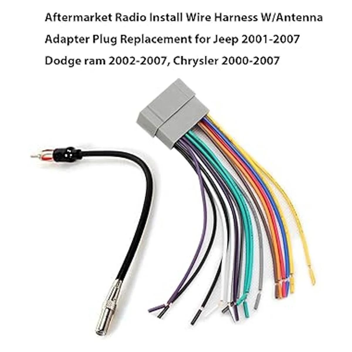 RED WOLF Arnés de cables de instalación de radio de repuesto con adaptador de antena de repuesto para Jeep 20032007, Dodge ram 20022007, Chrysler 20002007