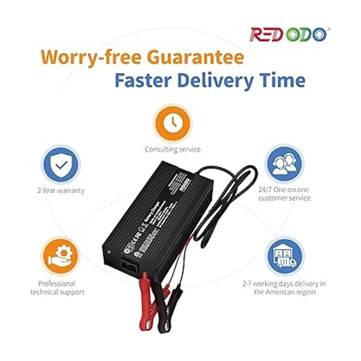 Garantía fiable y tiempo de entrega rápido Redodo ofrece una garantía de 2 años para todos los cargadores de baterías de litio con servicio al cliente uno en uno las 24 horas y soporte técnico de por vida. Si tienes alguna pregunta, no dudes en ponerte en contacto con nosotros.