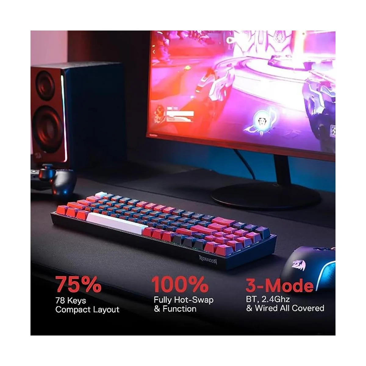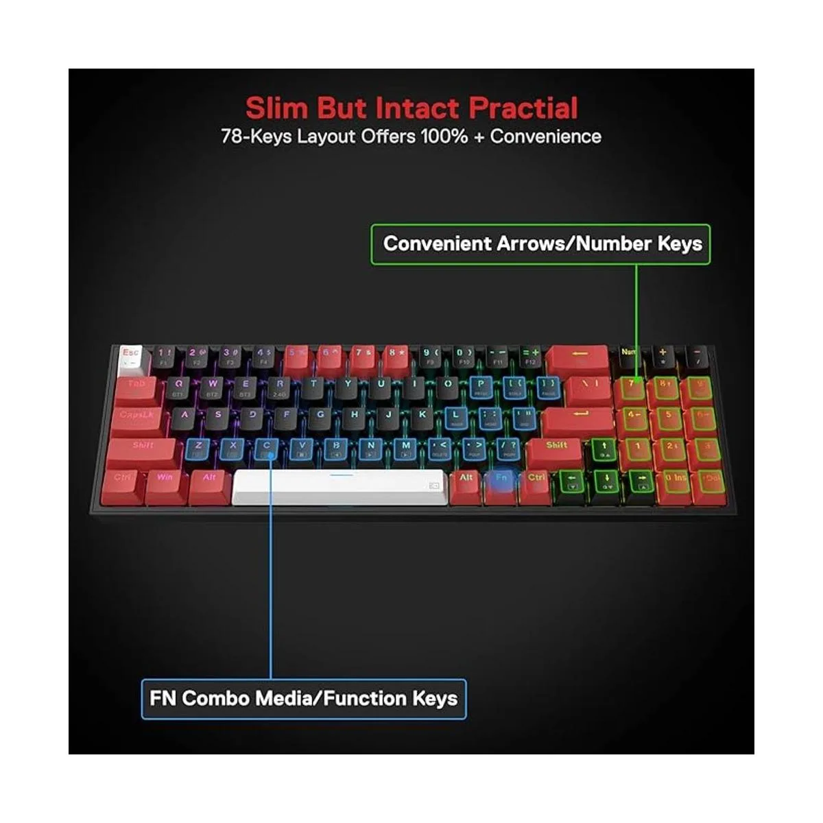 Prácticas teclas inteligentes de 78 teclas: Redragon 75 diseño K628 Pro en 3 modos satisface la necesidad del usuario de teclas de flecha separadas y teclas de número. El diseño de 78 teclas proporciona el máximo equilibrio de compacidad y funcionalidad de 104 teclas, lo que permite la curva de hábito más suave.