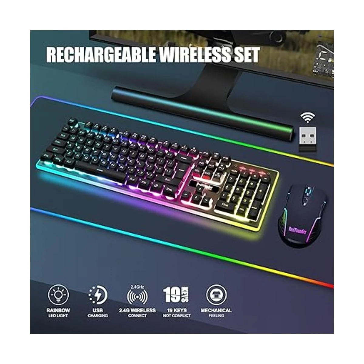 RedThunder K10 Combo de teclado y mouse inalámbrico para juegos, batería recargable con retroiluminación LED de 3800 mAh, teclado antifantasma de sensación mecánica ratones 7D de 3200 DPI para PC Gamer negro