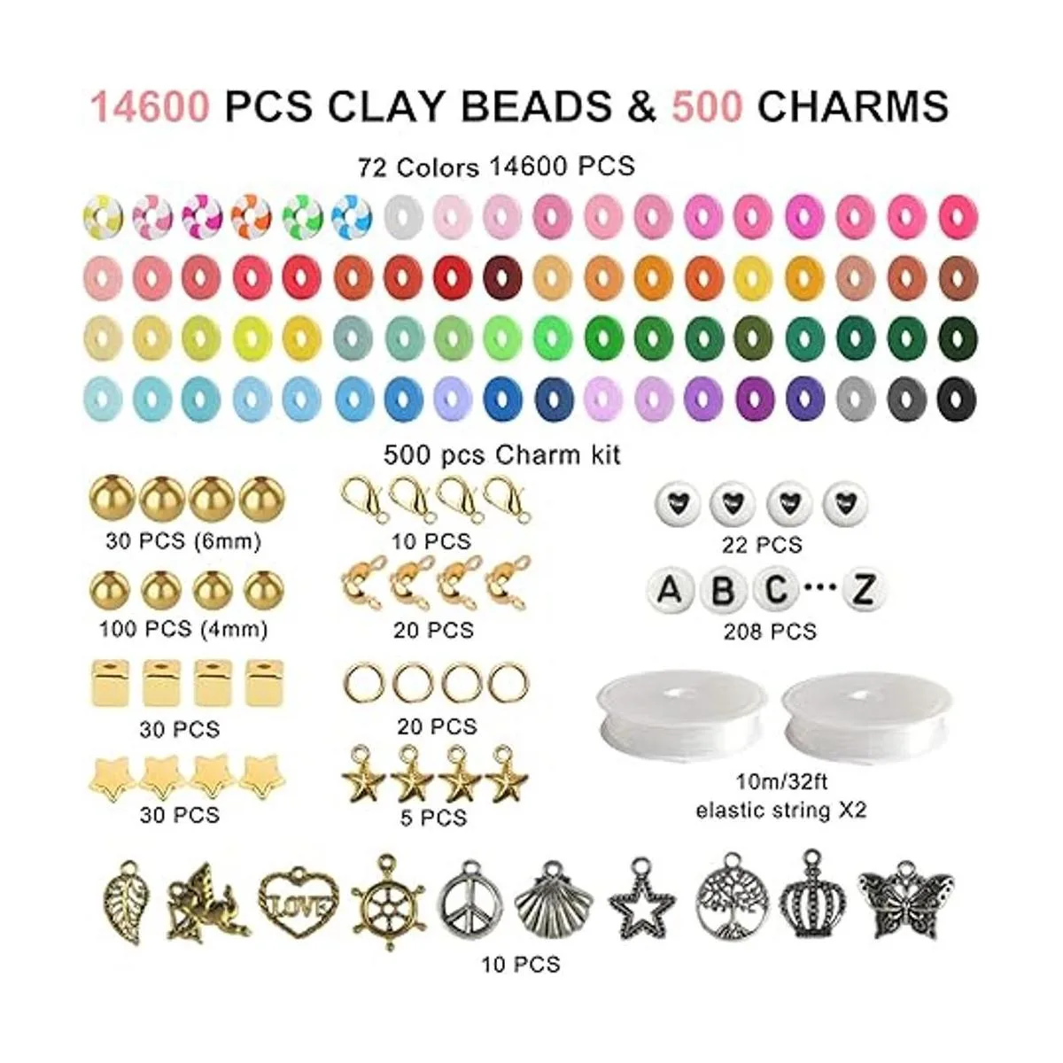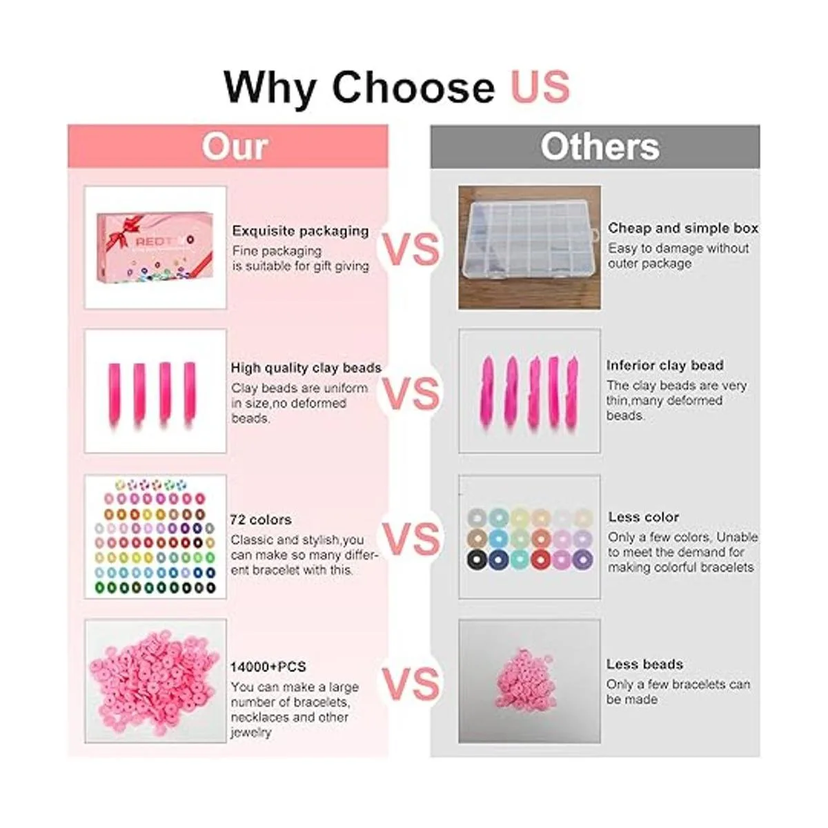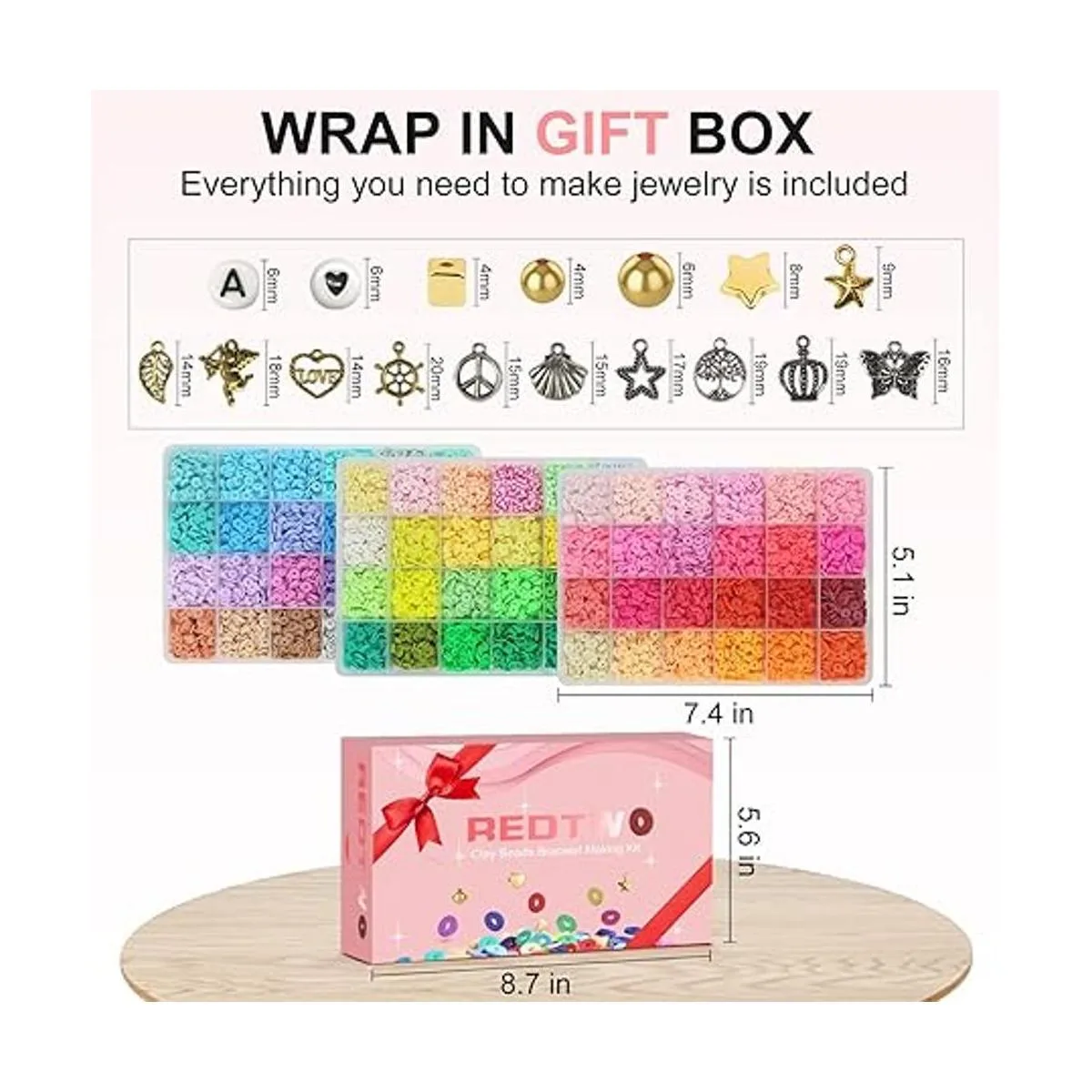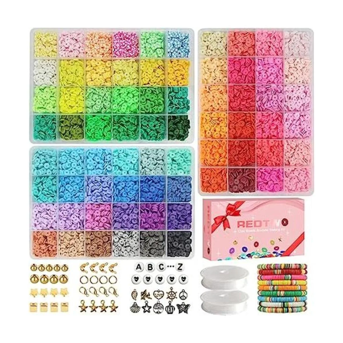 Redtwo Kit de fabricación de pulseras de cuentas de arcilla de 72 colores, 15000 piezas, cuentas Heishi de polímero redondas planas para hacer joyas con cuentas de letras y cuerdas elásticas, regalo de manualidades para niñas de 6 a 12 3 cajas