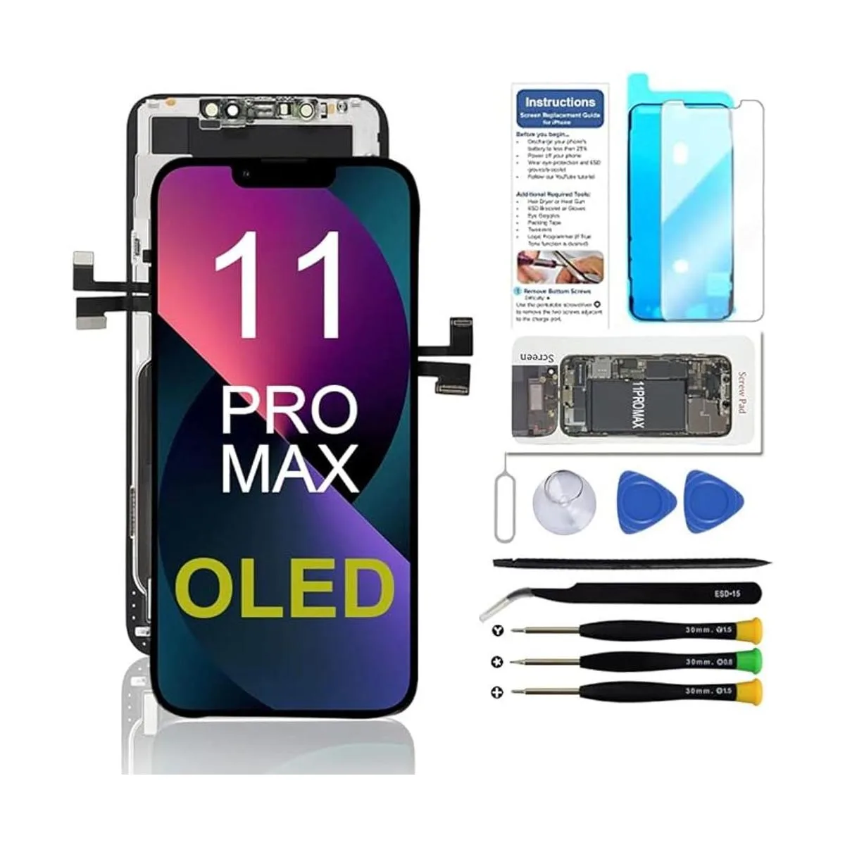 Contenido del paquete: 1 pantalla OLED de repuesto para iPhone 11 Pro Max de 6.5 pulgadas, un juego de herramientas de reparación 1 vidrio templado sello impermeable instrucciones almohadilla de tornillo