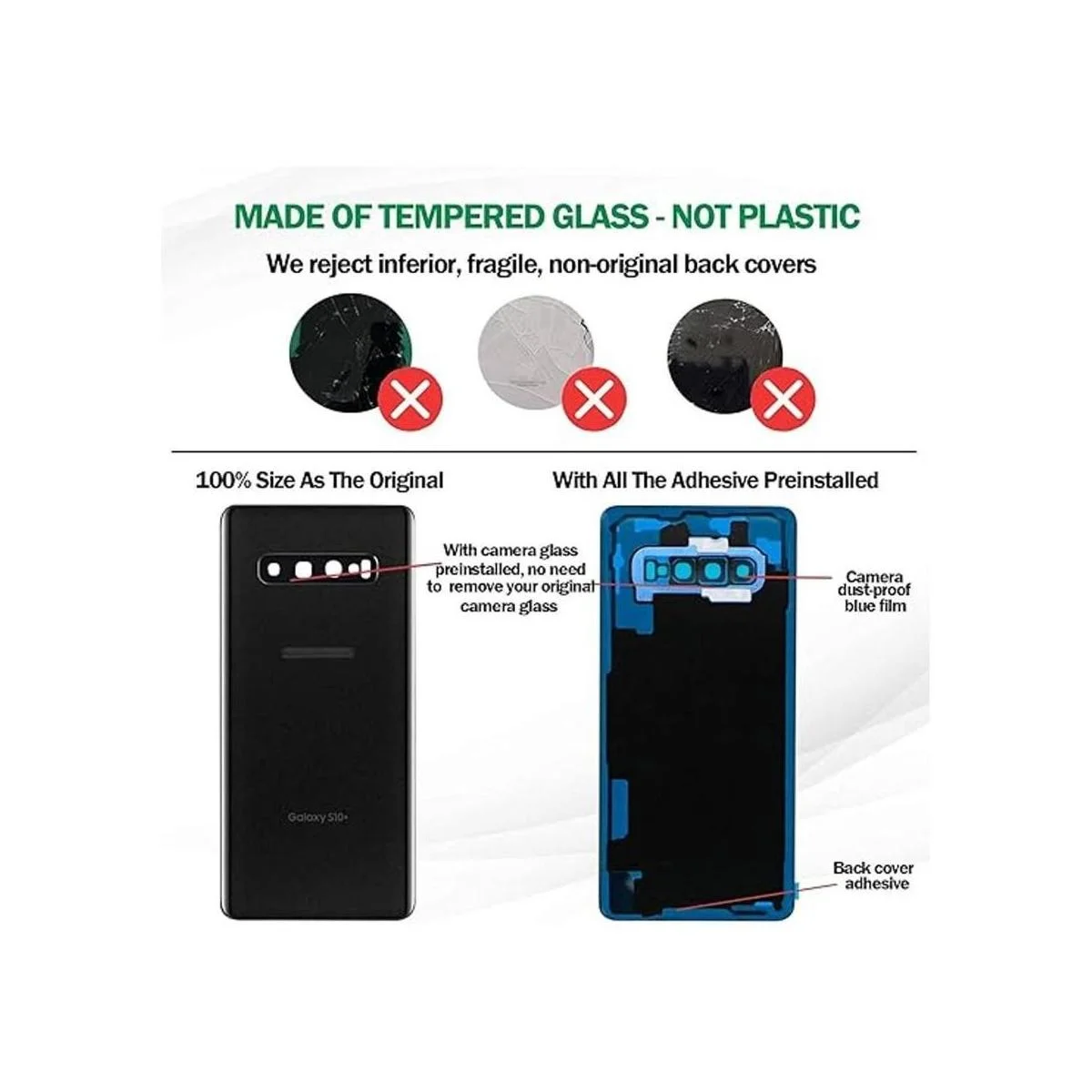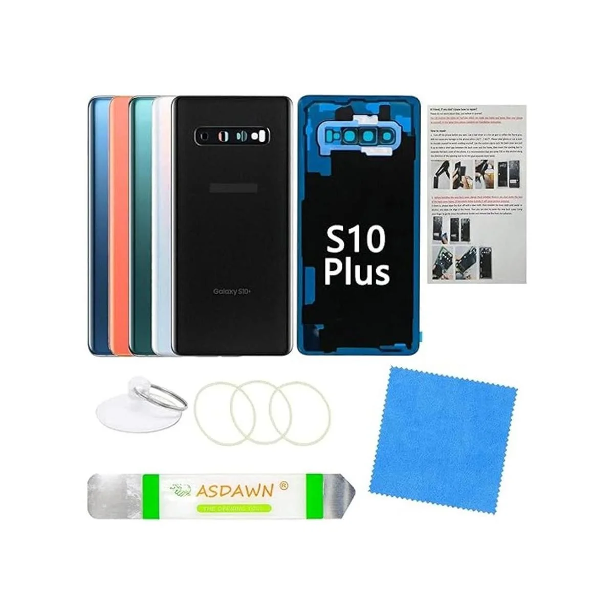 Fácil instalación y ahorra dinero Reemplazo de ajuste 100 perfecto. La carcasa de la puerta trasera de cristal para Galaxy S10 Plus viene con lente de marco de cámara preinstalada, adhesivo preinstalado y kit de herramientas de reparación. El manual de instrucciones paso a paso está incluido para que puedas instalarlo fácilmente. Disfruta de la diversión del bricolaje. Ahorra dinero comprando nuevas piezas de reparación de puertas de carcasa de vidrio para Galaxy S10 y haciendo la reparación en casa Restaura el dispositivo de nuevo a nuevo