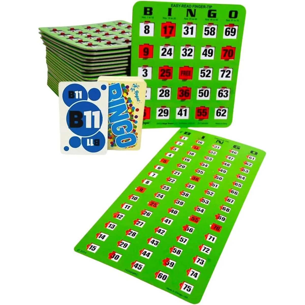 Regal Games Juego de bingo de tarjetas deslizantes con punta de dedo fácil de leer con tablero maestro y tarjetas de llamadas gigantes, color verde 10 tarjetas deslizantes de obturador de fácil lectura