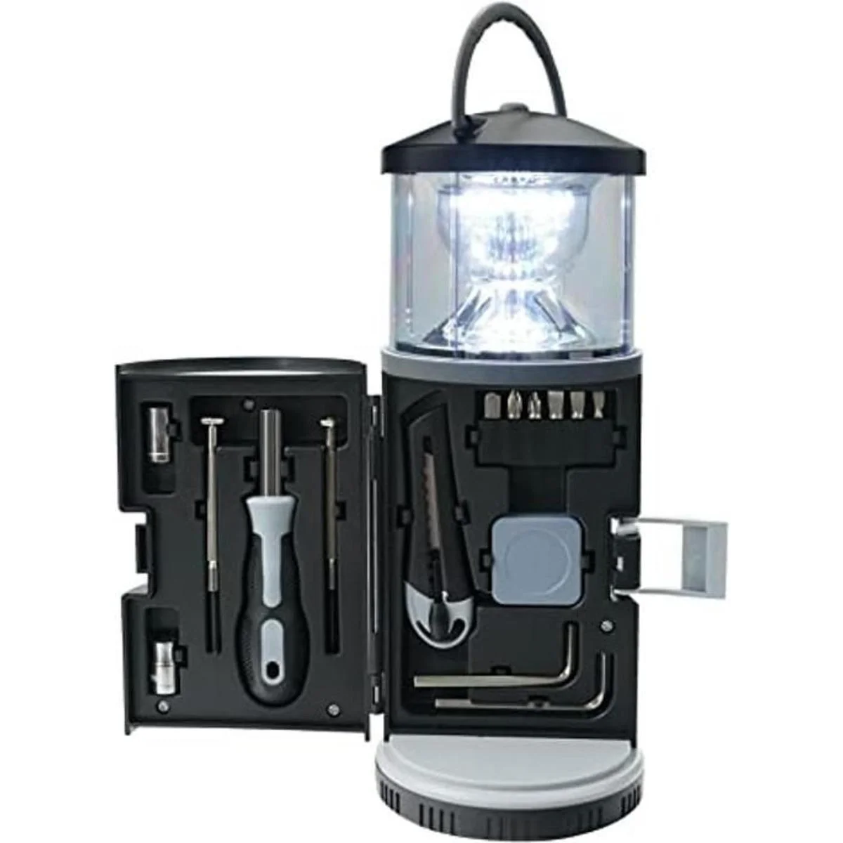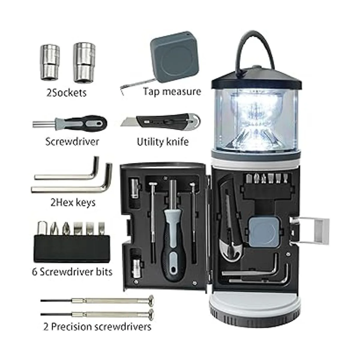 Regalos de camping únicos para papá Estás buscando un regalo único y genial para tus hombres Esta mini multiherramienta 2 en 1 es tanto una luz de camping como un juego de herramientas de hardware. Mango integrado, manga, taladro, regla, cuchillo utilitario y otras herramientas, fácil de operar y fácil de usar.