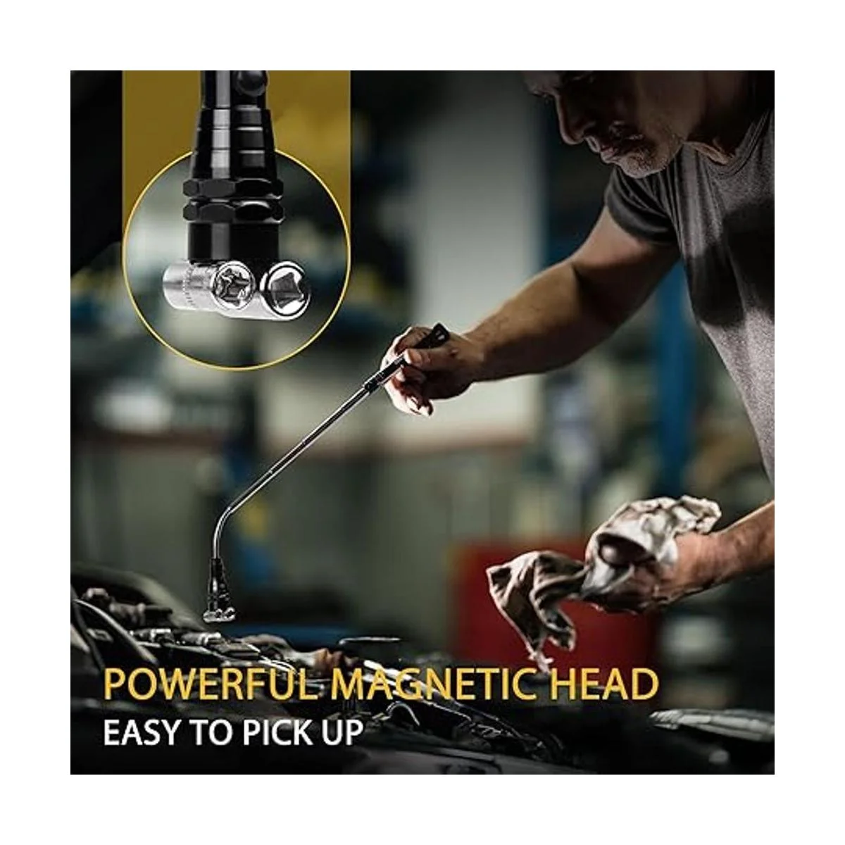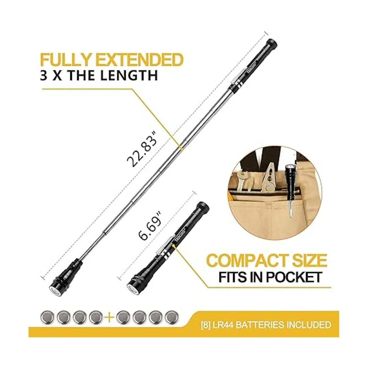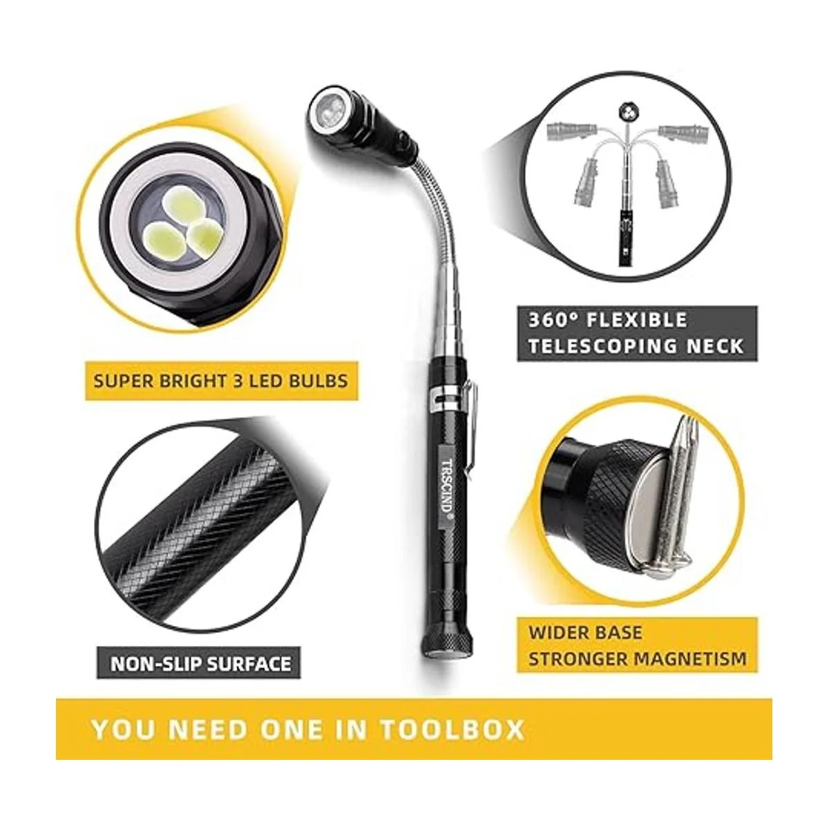 Gadgets geniales en tu caja de herramientas: el cuello telescópico flexible giratorio de 360 se extiende hasta 22.24 pulgadas para maniobrar alrededor de lugares difíciles de alcanzar. Con un clip de bolsillo puede ser fácil de llevar, puedes poner estas cosas geniales en tu bolsillo, como un buen ayudante para que puedas recoger algo. Perfecto para cualquier mecánico o manitas alrededor de la casa.