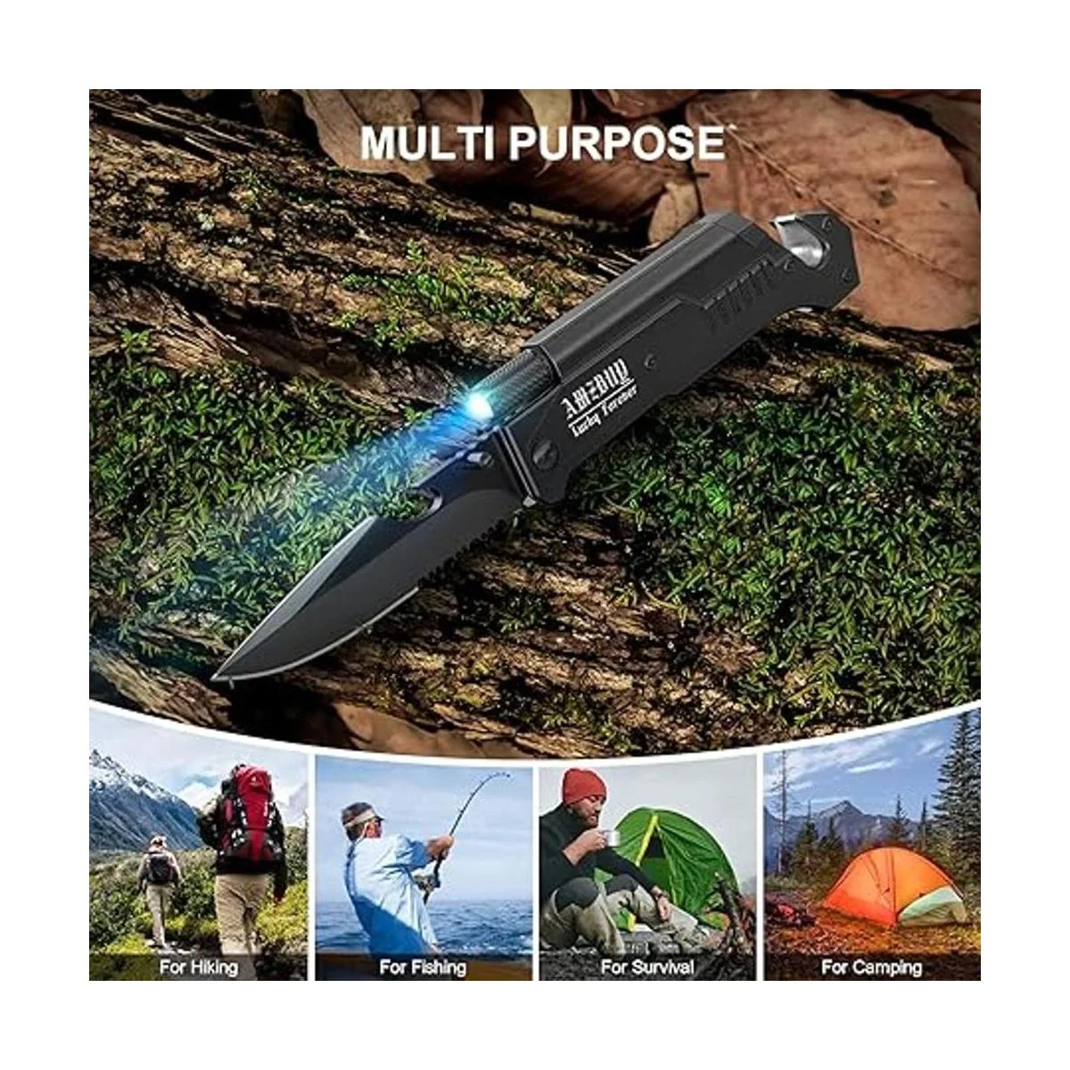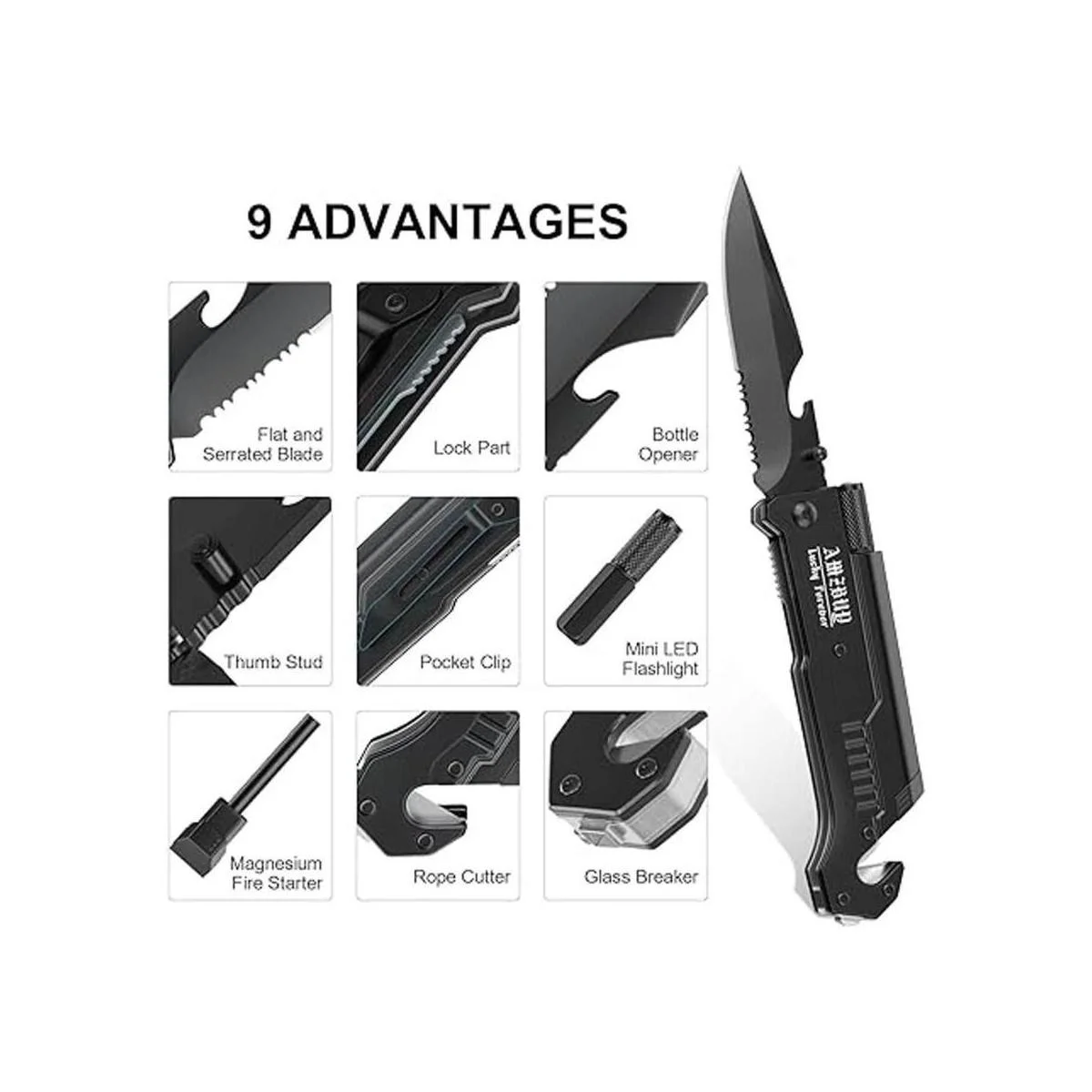 Cuchillo militar multifunción 7 en 1: el cuchillo multiherramienta de supervivencia de bolsillo te ayudará a resolver varias emergencias. Cuchillo y hoja dentada borde dentado para aserrar ramas finas, luz LED te permite trabajar en la oscuridad, cortador de cinturón de seguridad, interruptor de vidrio para situaciones accidentales, arranque de fuego garantiza una cocción segura de madera y pajita, abridor de botellas. Para todos los que necesitan un cuchillo extremadamente sólido para actividades al aire libre, el cuchillo multiherramienta AMZBUY EDC será una cosa útil y una elección perfecta