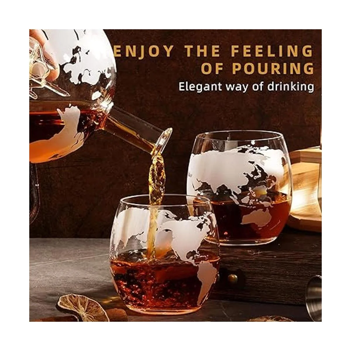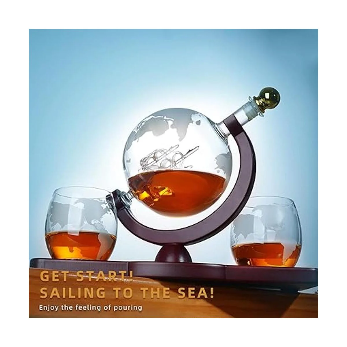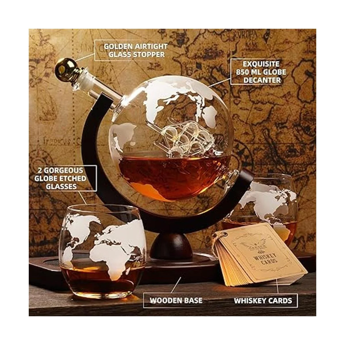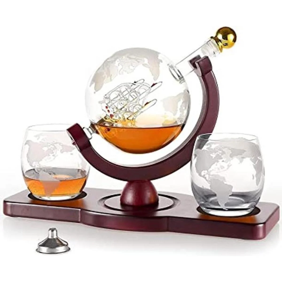 Exquisitos juegos de decantador de whisky: este juego de decantador de licor incluye decantador de globo de cristal que cuenta con un pequeño barco navegando por el mar del licor en el interior, 2 vasos de whisky grabados con mapa del mundo, que se ajustan en una bandeja de madera manchada. Mejora tu experiencia de beber mientras disfrutas de bebidas, ya que el tapón dorado resistente a fugas mantiene tus bebidas alcohólicas selladas. El embudo de acero inoxidable hace que sea más fácil verter licores en el decantador para alcohol sin derrames ni desorden.