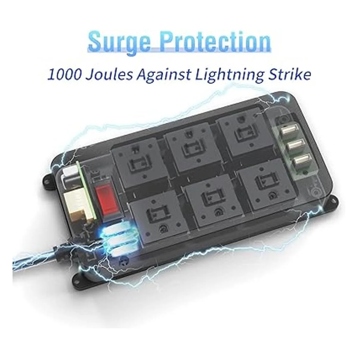 Regleta de protección contra sobretensiones con 3 puertos USB: 1000 julios MOV tiene protección contra sobrecorriente y sobrecalentamiento, y se desconecta automáticamente y recupera automáticamente las funciones duales, lo que puede proteger tus dispositivos contra golpes de rayo y sobretensiones repentinas.