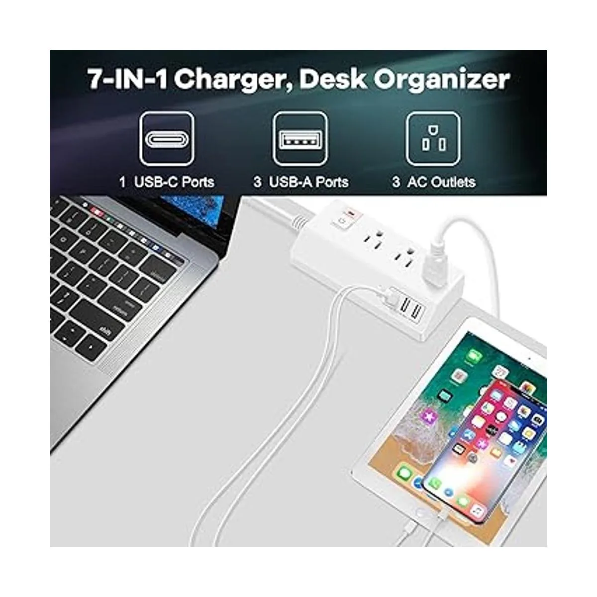 Enchufe de salida múltiple para múltiples dispositivos: este protector de sobretensiones de escritorio 7 en 1 combina 3 salidas de CA 1250 W 10 A y 4 puertos USB 3 USBA, 1 USB tipo C en una estación de alimentación para proporcionar energía y carga para hasta 7 dispositivos eléctricos de esta sola unidad, hace que tu carga sea más cómoda y organizada
