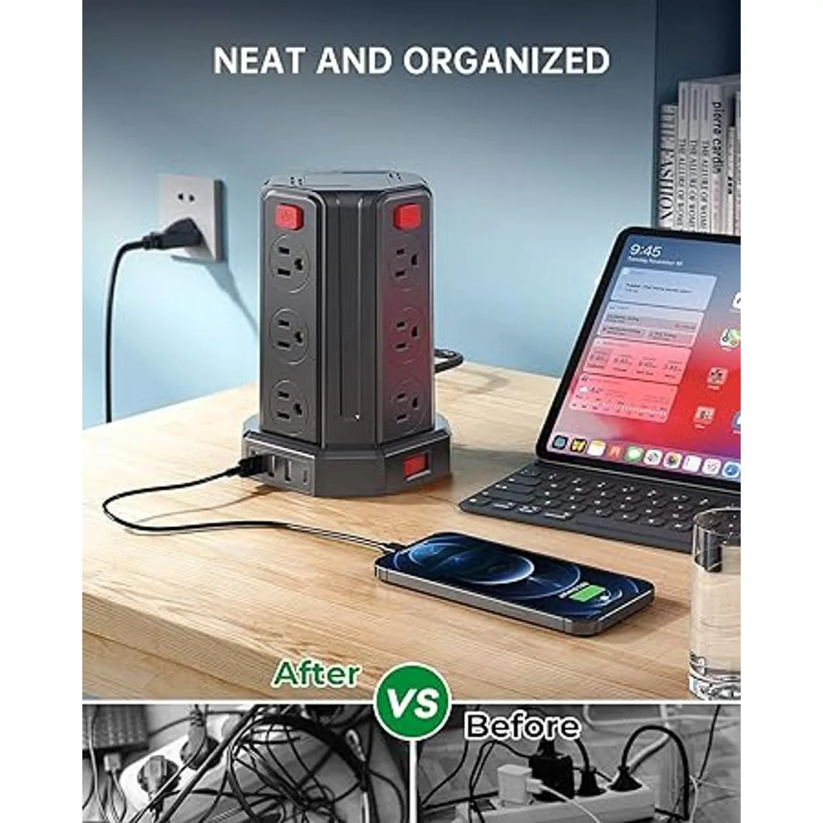 Regleta de protección contra sobretensiones con forma de torre con 12 enchufes de CA y 5 puertos USB, con cable de alimentación de 16.4 pies, apto para casa u oficina, estación de carga USB, para cargar celulares, se puede llevar de viaje