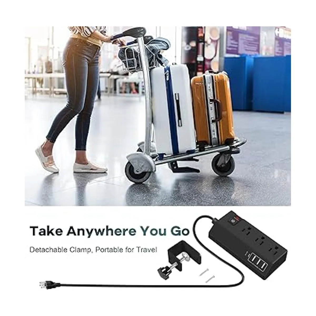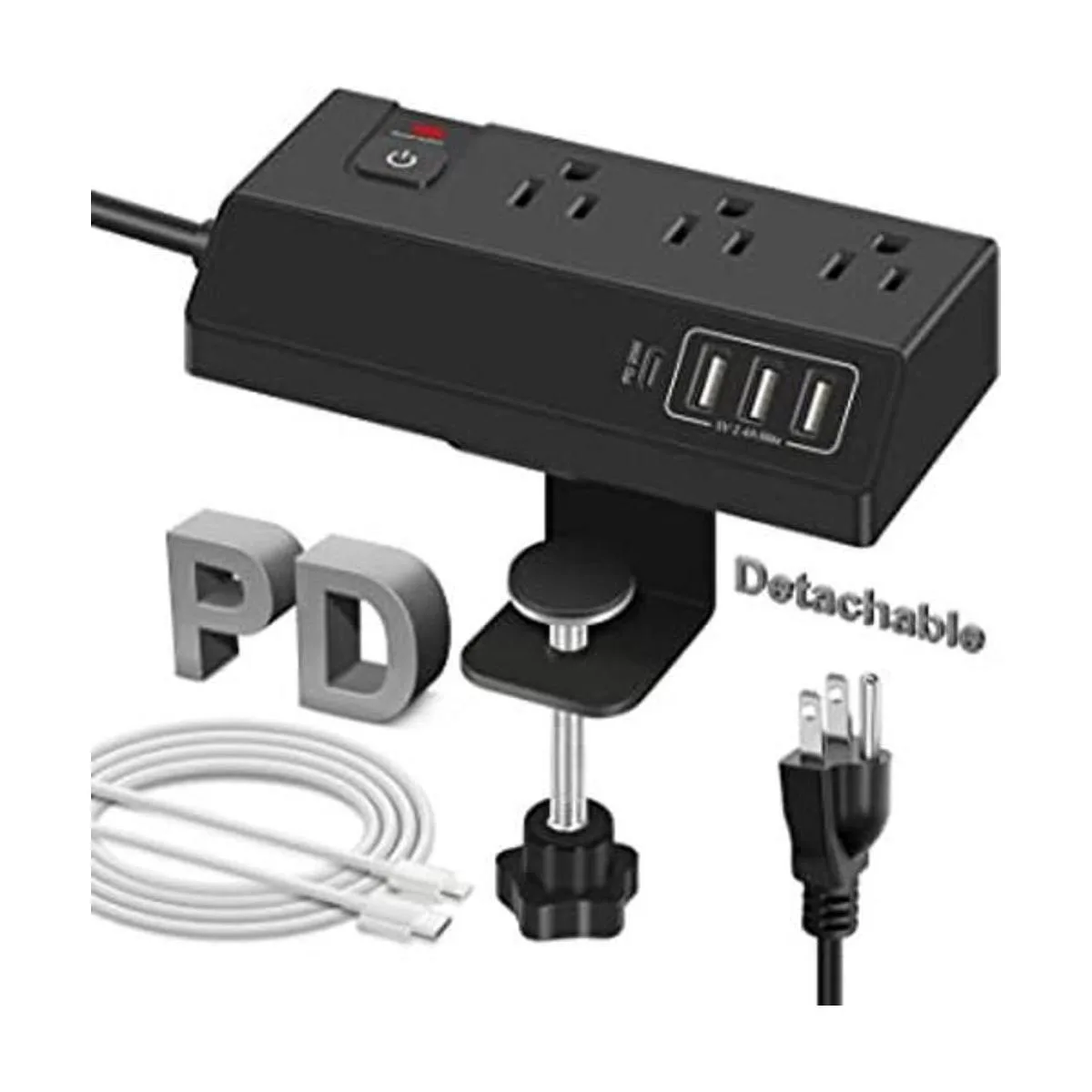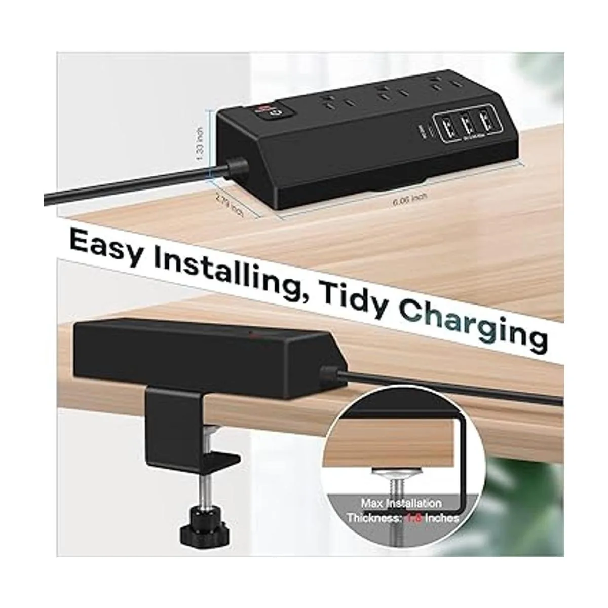 Tira de alimentación con clip, abrazadera desmontable: la abrazadera de esta tira de alimentación negra está diseñada para adaptarse a casi el 99 del grosor del escritorio americano hasta 1.8 pulgadas, muy fácil de instalar girando la perilla. Y la abrazadera está diseñada para ser desmontable, puedes desmontarla y utilizar solo la tira de alimentación anterior. Una gran estación de carga eléctrica para abrazadera de escritorio, montaje de borde de mesa, montaje de pared, montaje en escritorio, viajes y viajes de negocios