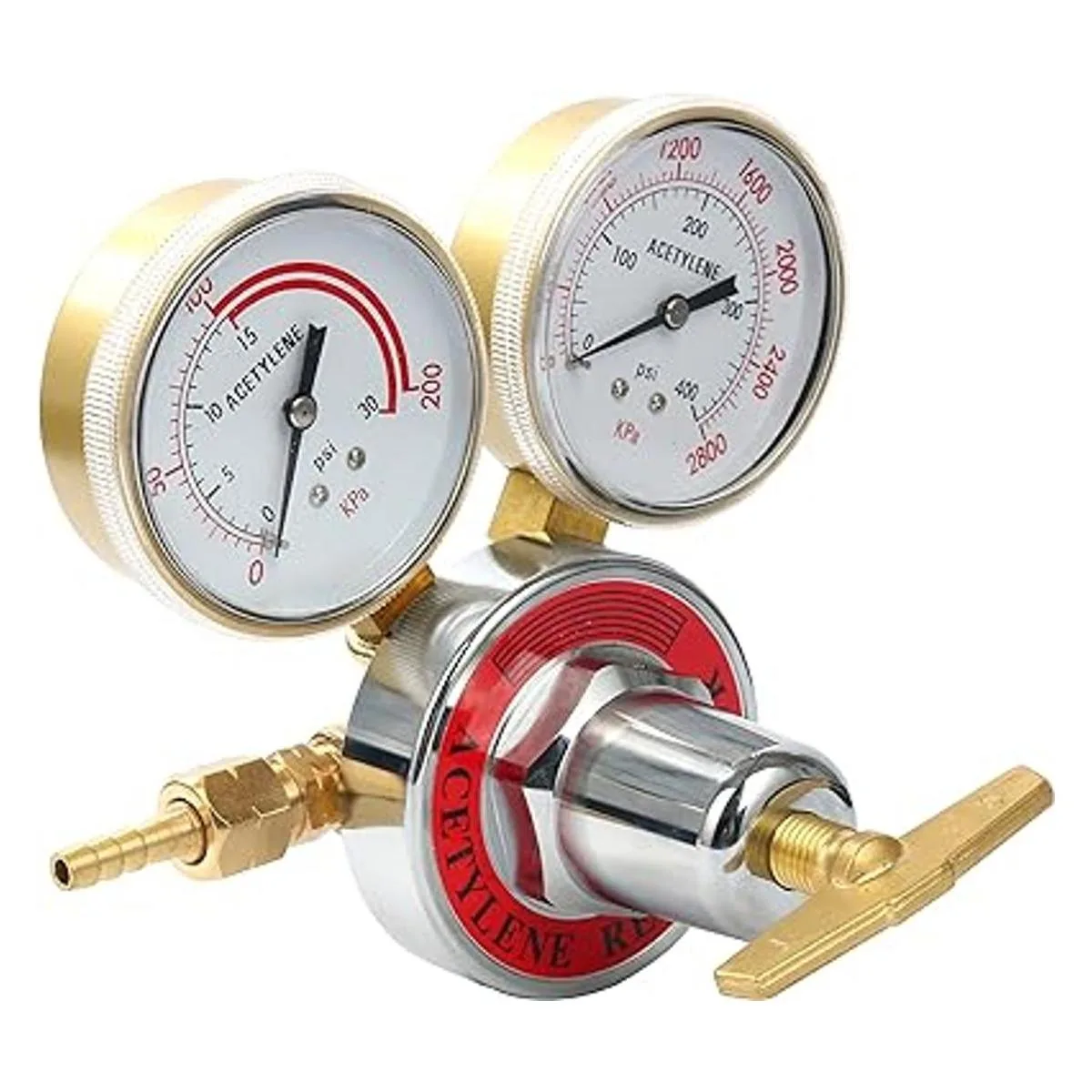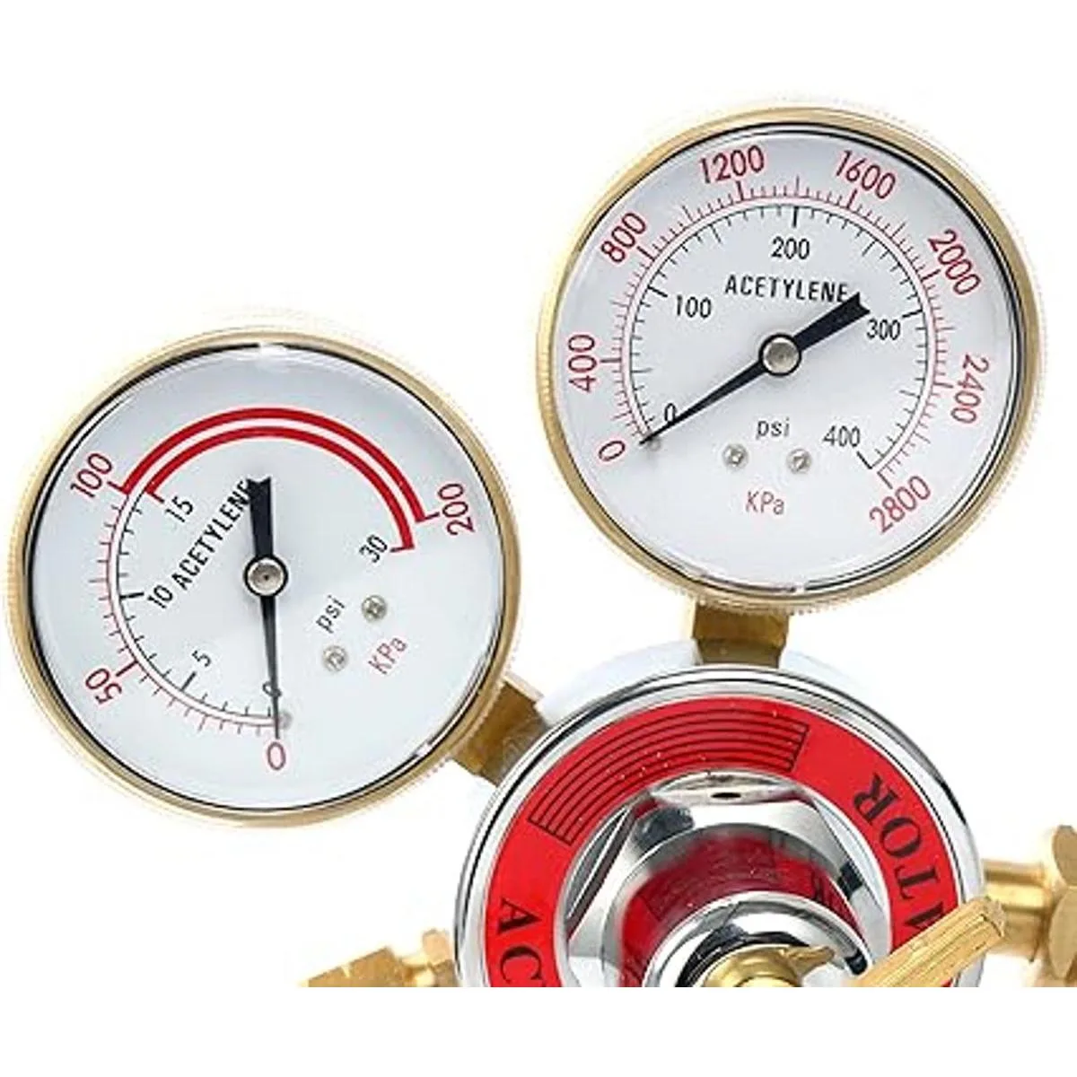 El regulador de acetileno tiene 2 5/8 pulgadas. calibres de diámetro, que muestran presión precisa;