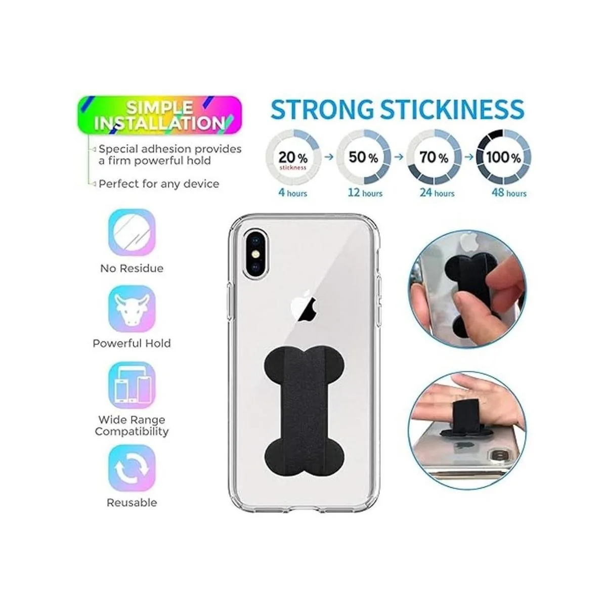 COMPATIBILITY Most smartphones and tablets. But the iPhone11/11pro/X/Xs/Xs Max/XR/8/8plus and 7/7plus color black models has an antifingerprint coating on the back of these devices that dont allow adhesive so we recommend a case with these phone models.